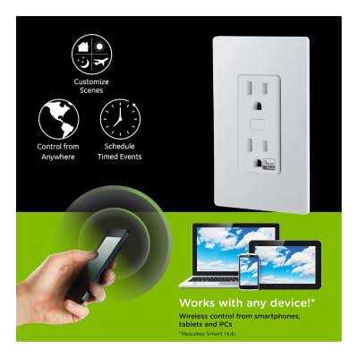 When paired with a compatible Z-Wave hub, the Enbrighten Z-Wave Plus Smart Receptacle, Tamper Resistant (700 Series) offers remote wireless control of On/Off commands for plug in lamp or appliance. This receptacle replaces any current wall outlet and is easy to install using the existing wiring in the home (requires a neutral wire). Thas Z-Wave Plus Smart Receptacle will make a perfect addition to your Z-Wave network because it can be included in home automation scenes. For example, you can plug in an exterior standing light and have it automatically turn on in the morning before going to work and have it turn off an hour after you leave. Requires a Z-Wave hub controller. Neutral wire required. Wallplate not included. Uses standard single-gang wallplate. For indoor use only. The switch is designed only for use with permanently installed fixtures. Frequency: 908.42/916 MHz. Total Max Load for Both Outlets: 1800W (15A), Resistive load. Range: Up to 150 feet. Part Number: 58449.