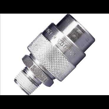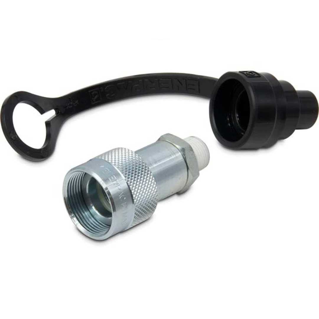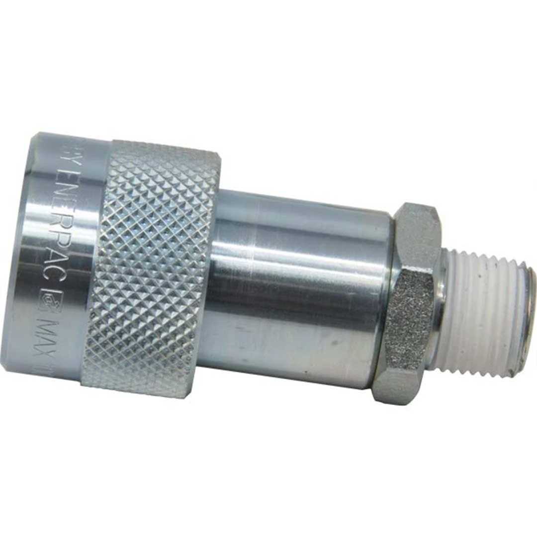 This Enerpac CR-400 fitting is the socket half of a quick-disconnect hydraulic coupler for shut-off when disconnected from the coupler plug. It is made of steel for strength and durability. It has a 3/8″ male National Pipe Taper NPT threaded connection on one end for connecting to a female hose fitting and a coupler connection on the other end. The maximum working pressure is 10000 pounds per square inch psi. This socket is compatible with the Enerpac high-flow plug CH-604 and is suitable for hydraulic applications including cylinders tools and pumps. Hose fittings connect control change the direction of and terminate the flow in piping and hose systems. They are made of brass stainless steel galvanized steel and other materials that resist corrosion pressure and wear. Hose fittings have various types of connections including threaded barbed push-to-connect dry disconnect and others including those based on internationally-accepted specifications. Hose fittings are used in systems such as air compressors automatic manufacturing operations aircraft controls and tire installation in industries including agriculture mining road construction firefighting and aviation. Enerpac manufactures high-pressure tools and equipment for industrial applications. The company founded in 1910 is headquartered in Menomonee Falls WI.
