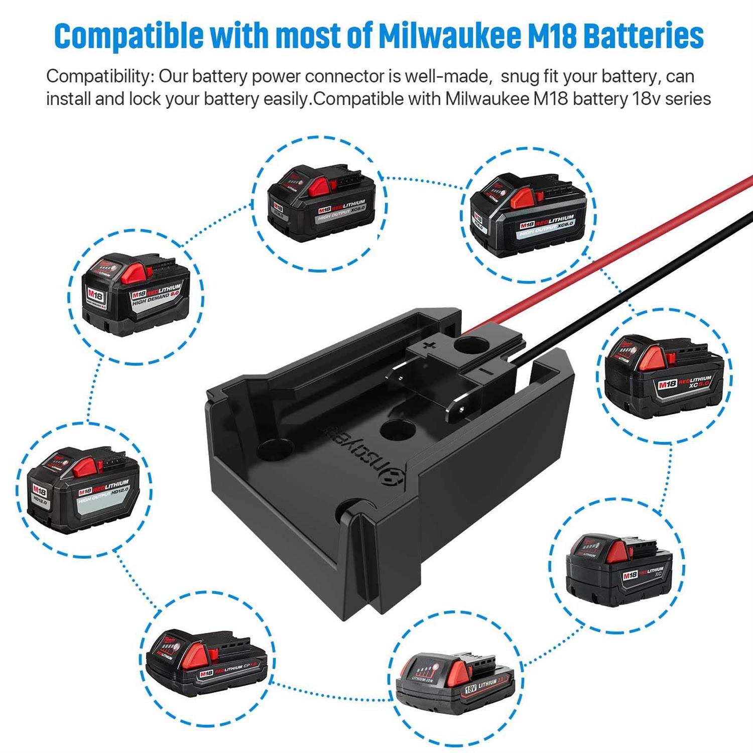 - Compatibility: Our battery power connector is well-made, snug fit your battery, can install and lock your battery easily.Compatible with Milwaukee M18.