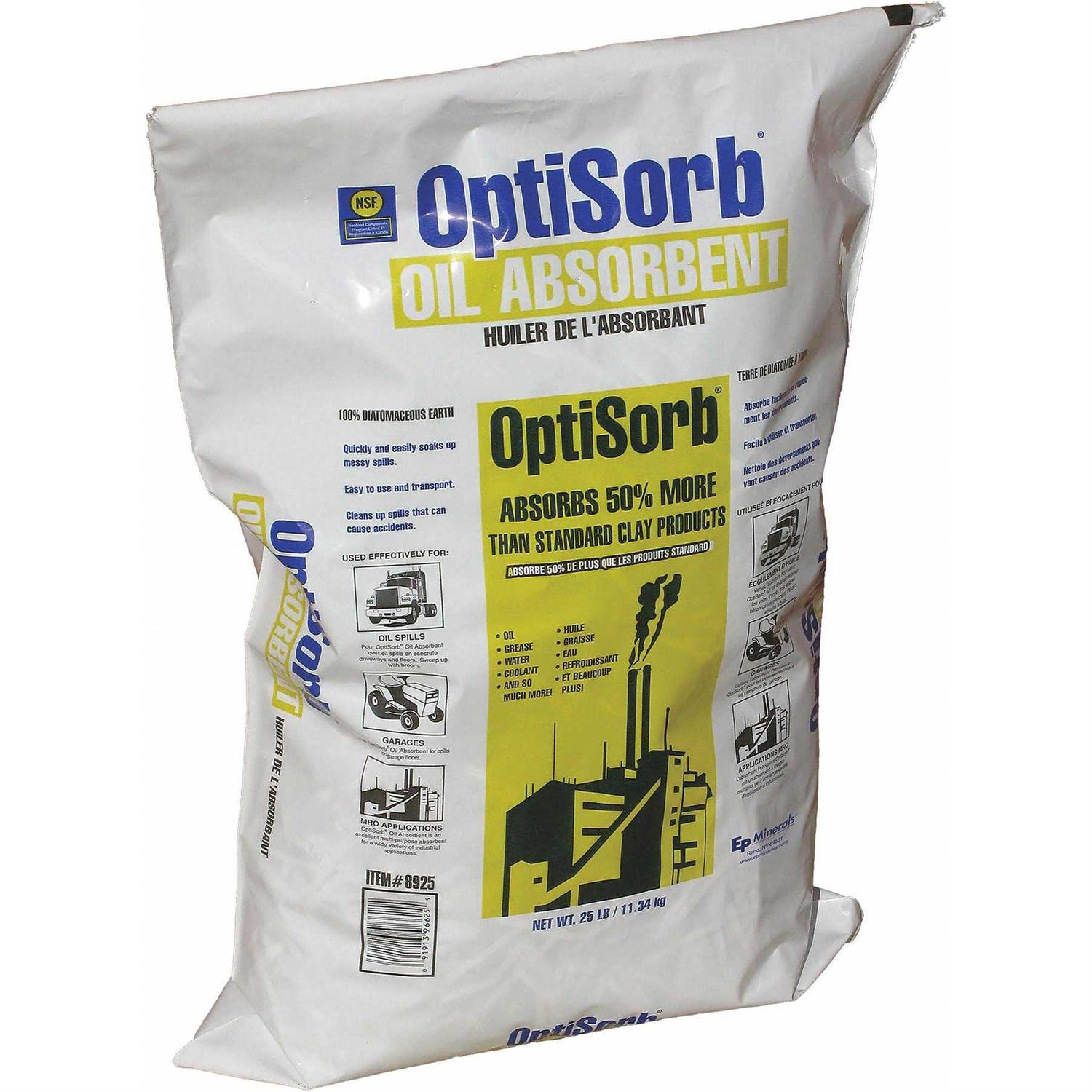 OptiSorb Premium oil absorbent is an all-purpose absorbent designed for the quick cleanup of water, oil and grease. Made from diatomaceous earth, a naturally occurring mineral with superior absorptive ability, this high quality product delivers 50% more absorbency per pound than clay alternatives. OptiSorb premium oil absorbent is available in a paper bag or a leak-resistant and moisture-resistant poly bag. Quickly and easily soaks up messy spills. Quickly and easily soaks up messy spills. Provides more absorption for the money. Cleans up spills that can cause accidents. Easy to use and transport. 100% natural mineral.
