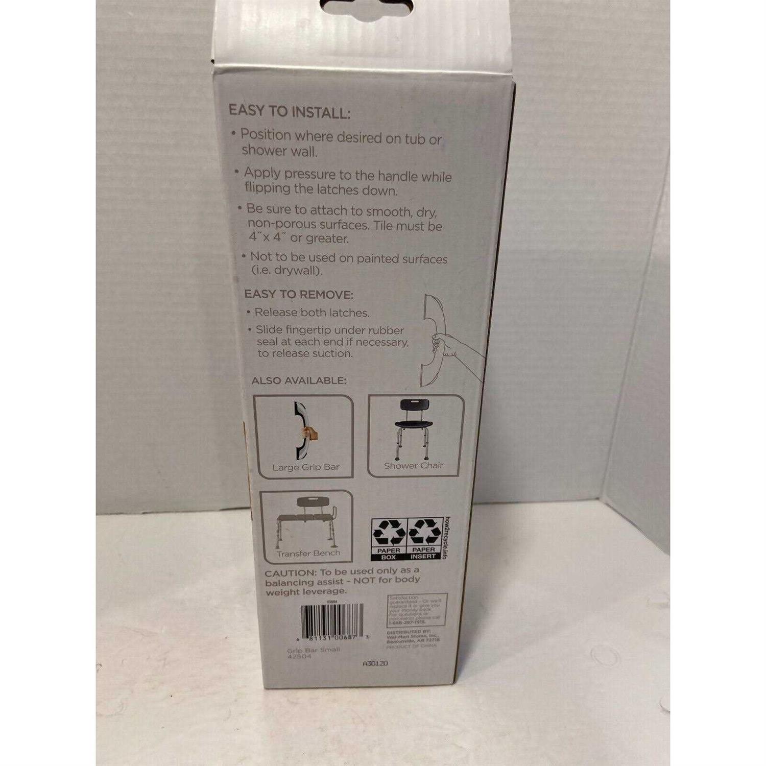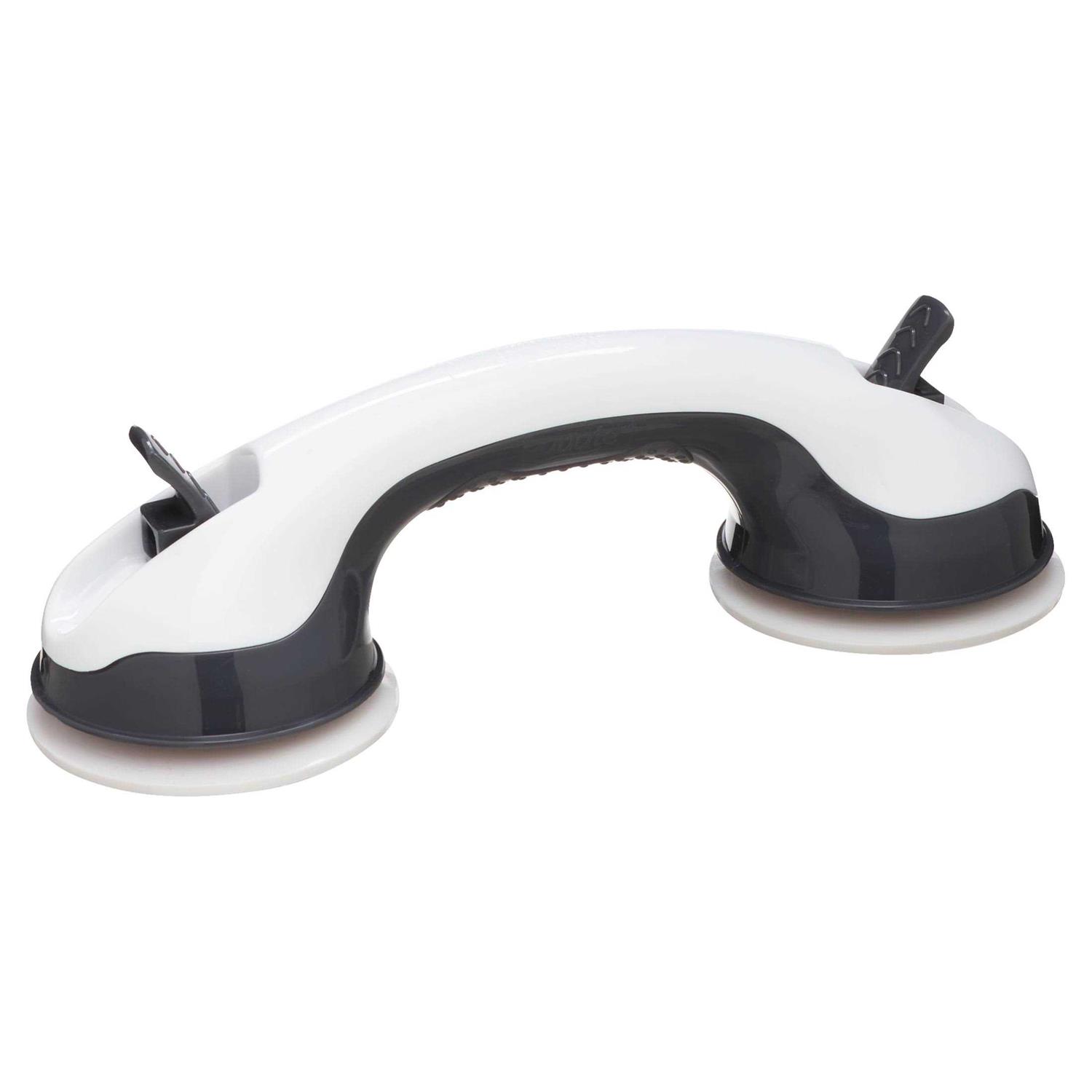 Promote a safer environment in the bathroom with this 11.5″ Equate Grab Bar. It’s made of sturdy plastic and is easy to maintain. The bathroom grab bar allows the user to enter and exit a bathtub or a shower safely and with confidence. It features a large, textured handle with a rubber grip that provides sustained comfort and control for improved stability. This portable bathroom aid also features easy-release locking tabs that make installing or relocating the product quick as well as easy, with no additional tools required. And, it has suction cups on the bottom that let you secure it to any smooth, dry, non-porous surfaces.
