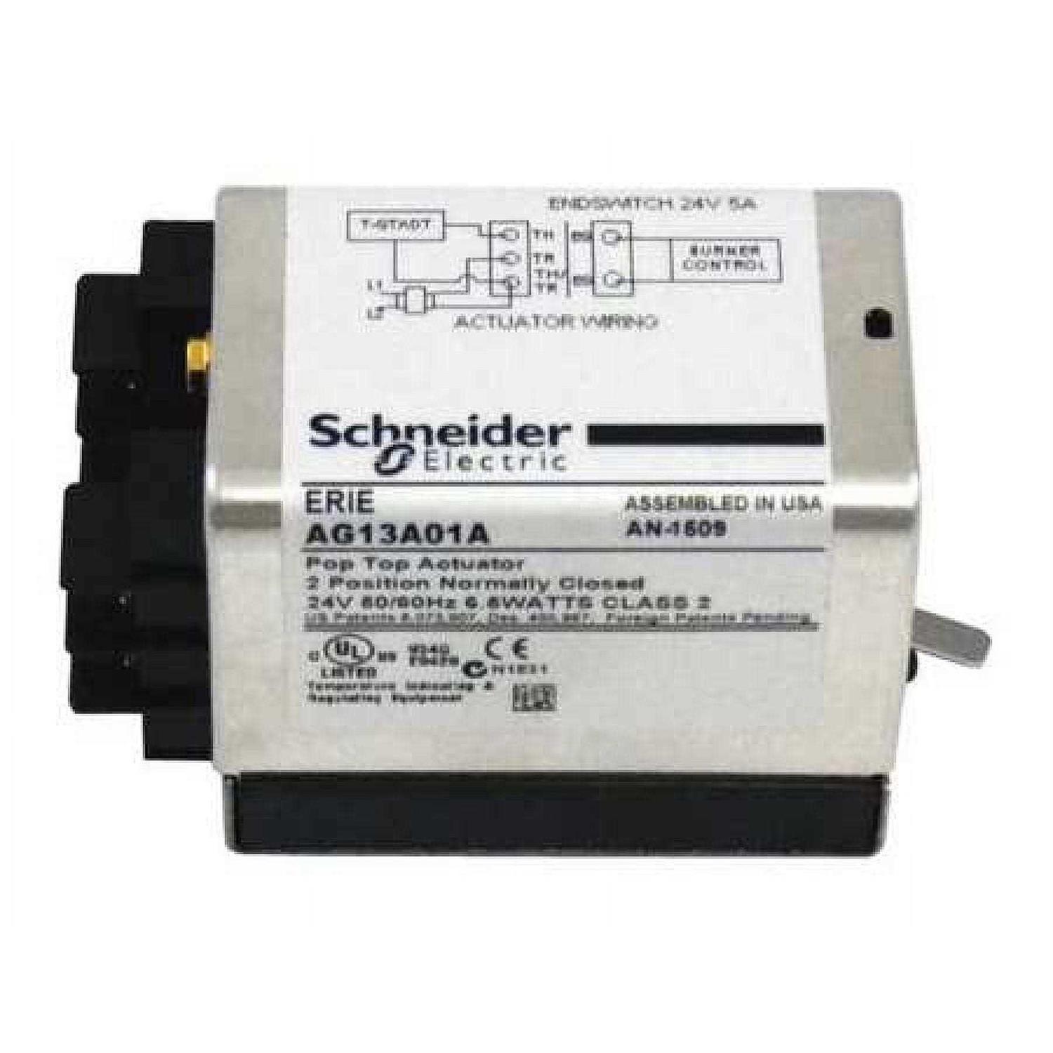 Erie AG13A01A Actuator | w/ Terminal Block & End Switch, 2 Position Spring (24v)Description The PopTop series valve bodies and actuators provide easy installation for a variety of heating and cooling applications.The valve’s actuator can be installed after the valve body has been installed onto the fan coil, baseboard or air handler. Features Synchronous motor drive with spring return. Variety of voltages available. Mounts directly onto the body without the need for linkages or calibration. Manual override lever on normally closed actuators.