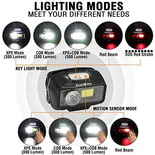 Everbrite Rechargeable HEADLAMP, LED Bright Motion Sensor Head Lamp Flashlight with 9 Modes, Adjustable Headlight for Adults Kids with White Red