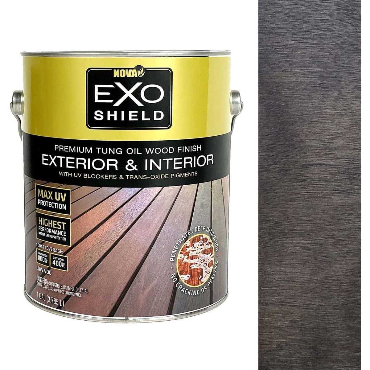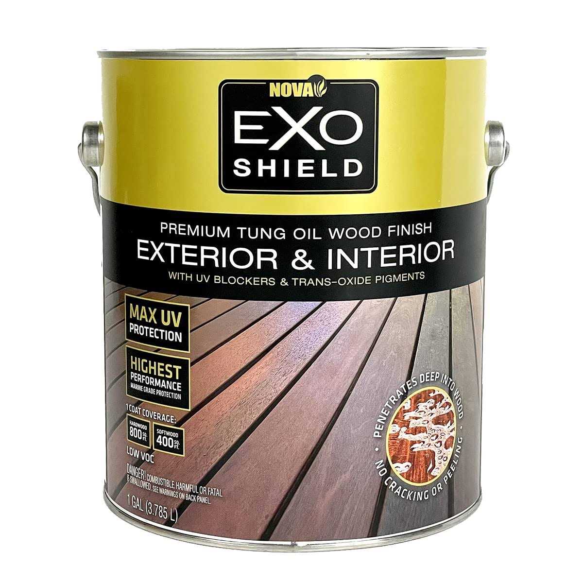 The Best Deck Stain from Nova- ExoShield Black Walnut Tung Oil Exterior Wood Stain Gallon ExoShield is suitable for use on all hardwoods and softwoods. Coverage varies by species of wood. ExoShield will cover 800 to 1000 SF on high density hardwoods and 300-500 SF of typical softwoods. ExoShield is suitable for both exterior and interior wood projects including furniture decking siding fencing and more. Excellent for use on Ipe Batu Mahogany Cumaru Sapele Cambara Eucalyptus Oak Walnut Hickory Birch Douglas Fir Cedar Redwood Hemlock and more. Pure Tung Oil is blended with Transoxide Pigments Fungicide UV blockers and Low VOC solvents to create the highest quality finish available on the market. ExoShield exterior wood stain takes advantage of the penetrative and protective properties that Tung Oil contains to create a naturally durable finish with exceptional color stability. The Tung Oil used in ExoShield exterior wood stain provides a naturally water-resistant acid-resistant and easy to use wood stain for all your decking siding fencing and outdoor furniture needs. ExoShield wood stain stabilizes the wood and greatly reduces the chances of boards cracking or warping. Up to 800 SF of Coverage on Hardwoods Low VOC, All Natural Product more For Ipe, Batu Mahogany, Cumaru, Tigerwood, Hardwood & Softwoods Marine Grade Components Longest Lasting Wood Stain Available