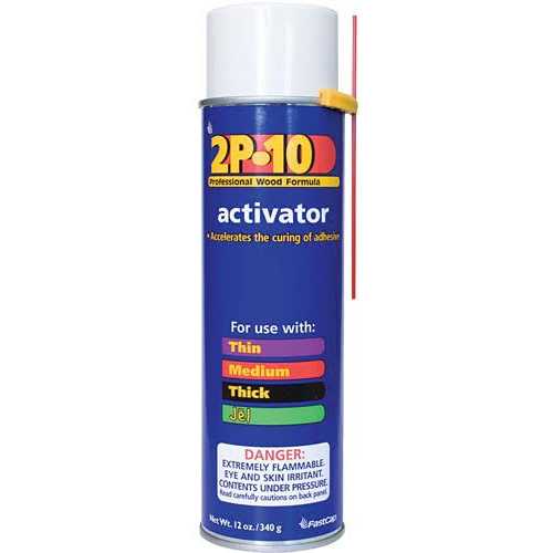 Produces 10 second bond time when used with 2P-10 Adhesives. 2P-10 can be used on any material as long as it is clean and the surface is well prepared. The surface should be clean, with no oil, and slightly etched so the glue can bite more effectively. It should not be used in lieu of a weld (on metal), but it is very effective for tacking, to hold a piece in place.