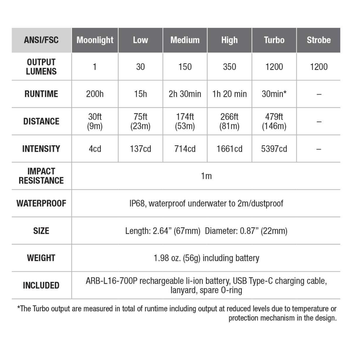 - Uses a Fenix ARB-L16-700P 16340 battery