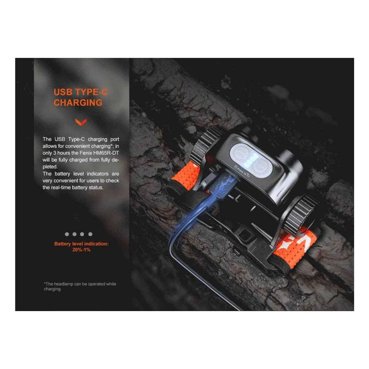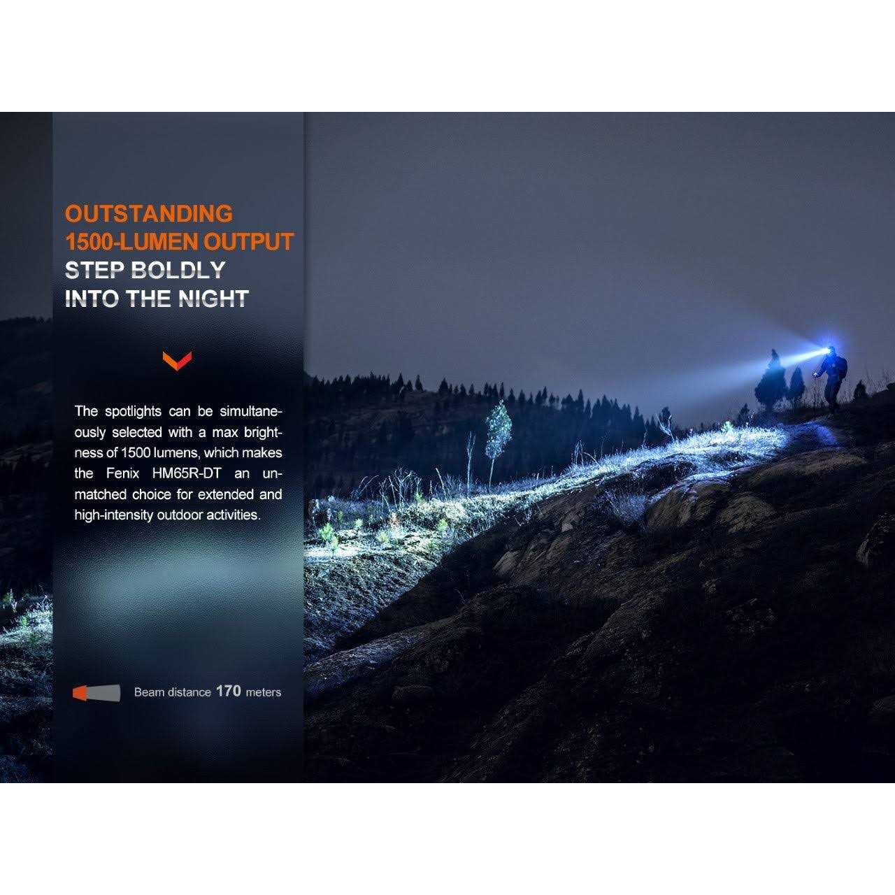 The Fenix HM65R-DT is a high-performance headlamp designed for trail running. It features white light and warm white dual beams, providing 1500 lumens of brightness and a throw of up to 186 yards. The white light mode is perfect for providing clear visibility of road conditions from a distance, while the warm white light reduces eye strain and ensures clear vision in rough weather. With three brightness levels and two beam colors, it offers remarkable versatility to meet various outdoor demands, making the HM65R-DT an ideal companion for activities like trail running, jogging, hiking, and camping. The HM65R-DT is USB-C rechargeable with a LED battery life indicator. Its widened reflective headband ensures breathability and a stable fit, while the SPORT fit system fastener allows for easy one-handed adjustment. With a 60-degree tilt rotation, you can shine light wherever you need it. Crafted from lightweight magnesium alloy, the headlamp is durable yet 30% lighter than aluminum. It is also impact-resistant and boasts an IP68 waterproof rating. In summary, the Fenix HM65R-DT is a lightweight, user-friendly headlamp suitable for hiking, trail running, and outdoor adventures, offering powerful illumination and versatile features.