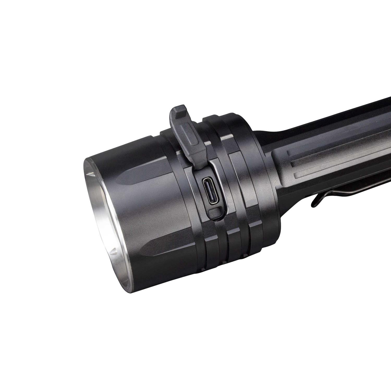One of the brightest flashlights ever made by Fenix the Fenix LR35R flashlight throws a powerful 10000 lumen beam at over 546 yards great for search and rescue or outdoor adventures like hunting spelunking or exploration. It has an incredibly easy-to-use single side switch for all operations allowing you to quickly cycle through five modes and access strobe. All of this power fits comfortably in the palm of your hand. At only 5.5 inches in length this powerful flashlight can be comfortably carried or included in any outdoor kit. The LR35R comes with 2x cold resistant 21700 batteries that yield up to 80 hours of maximum runtime. Plug the included charging cable into the protected USB-C port for fast and convenient charging. The side switch has a built-in battery level indicator so you are never in the dark. You can also save battery by locking the LR35R with a simple double tap of the side button just double tap again to unlock. The LR35R is machined from durable aluminium alloy and is IP68 rated waterproof a high quality tool for all long range applications.