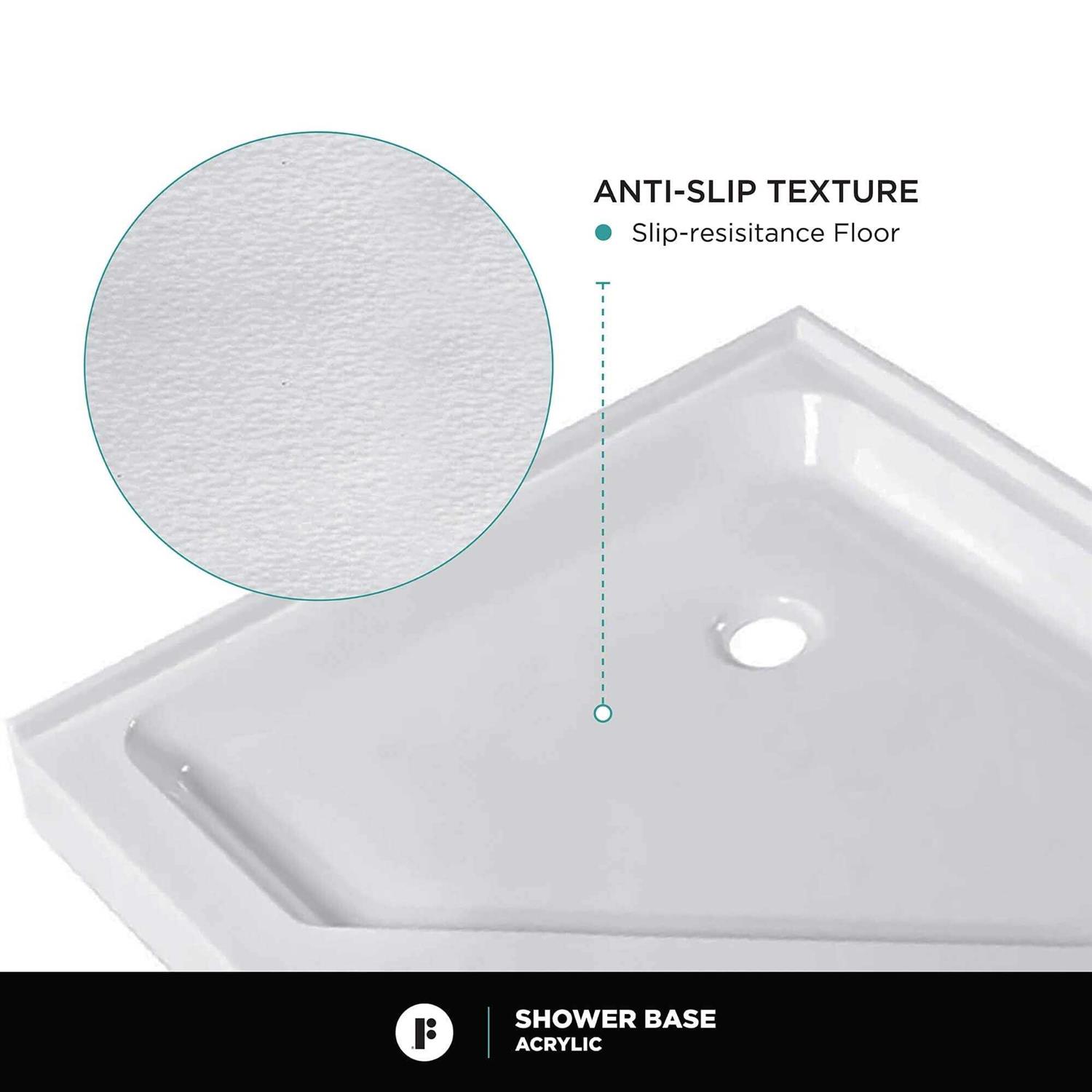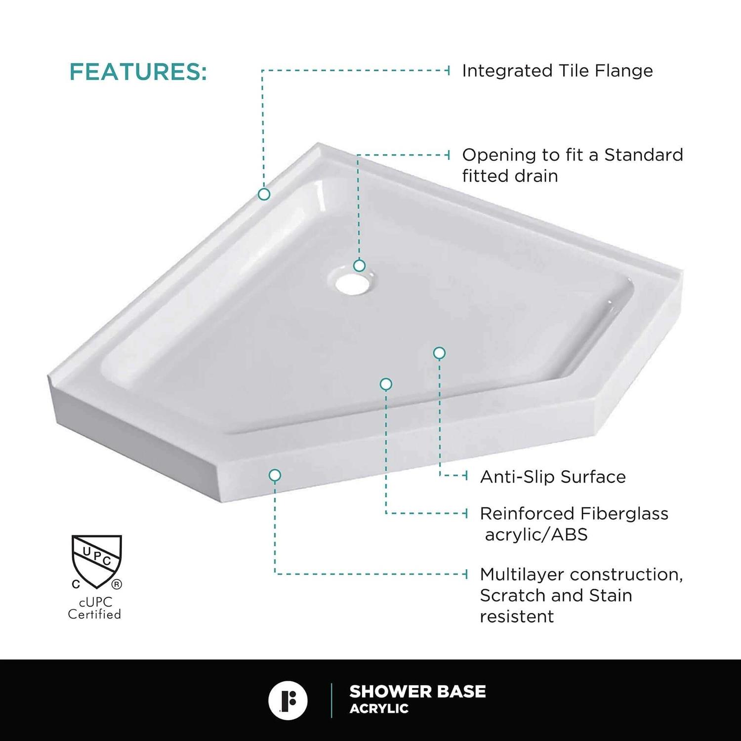 Bathrooms come in all shapes and sizes, and so should your shower bases. These fiberglass acrylic shower pans are perfect in any setting and come in three convenient sizes. Our neo-angle corner shower base is perfect for compact spaces, it is made to be installed in a corner. The clean, modern lines of this bathroom shower base look stylish and neat so you dont have to compromise on appearance. Crafted of a fine gloss white acrylic with a fiberglass core, the base is resistant to scratching and fading, and is easy to clean and maintain. Our shower bases are constructed with a durable non-slip texture that ensures comfort and safety while showering. The built in structural support on each shower base provides a solid foundation. They also come with an integrated tile flange as well as a low curb. They are waterproof and leak-proof and the opening is made to fit a standard fitted drain. Whether it’s a new construction or a remodel, our shower pans are an excellent choice for most bathrooms.