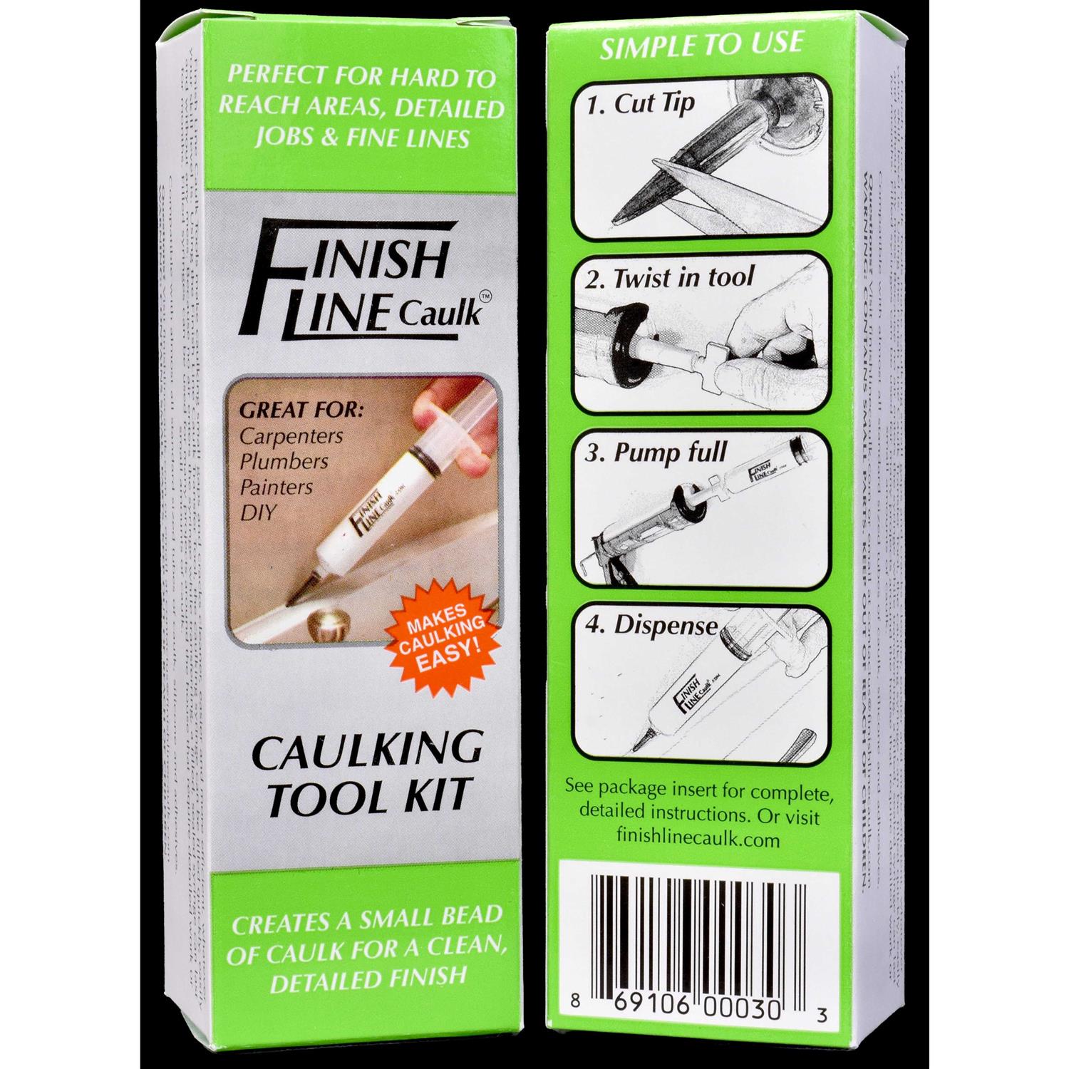 The Finish Line Caulk tool is a precision caulking system. Use the included caulk transfer piece to quickly and easily fill the precision applicators. The single kit includes a caulk transfer piece with cap, a 1 oz caulking syringe with cap, and 2 adjustable dispensing tips. Ideal for projects that require detailed work or small amounts of caulk. Our precision caulking tool makes caulking jobs cleaner, easier, and gives more professional looking results no matter what your skill level is. *Caulking tools and accessories work best with many latex, acrylic and siliconized acrylic latex caulk. *Not intended for use with pure silicone. Introducing the Finish Line Precision Caulk System, the ultimate solution for achieving professional-quality caulking results with precision and ease. This innovative system is designed to provide precise control and perfect bead application, allowing users to effortlessly achieve clean and seamless finishes with every application. Whether you’re a seasoned professional or a DIY enthusiast, the Finish Line Precision Caulk System offers a convenient and mess-free way to tackle any caulking project with confidence. Say goodbye to messy, uneven caulk lines and hello to a new level of precision and efficiency with the Finish Line Precision Caulk System.