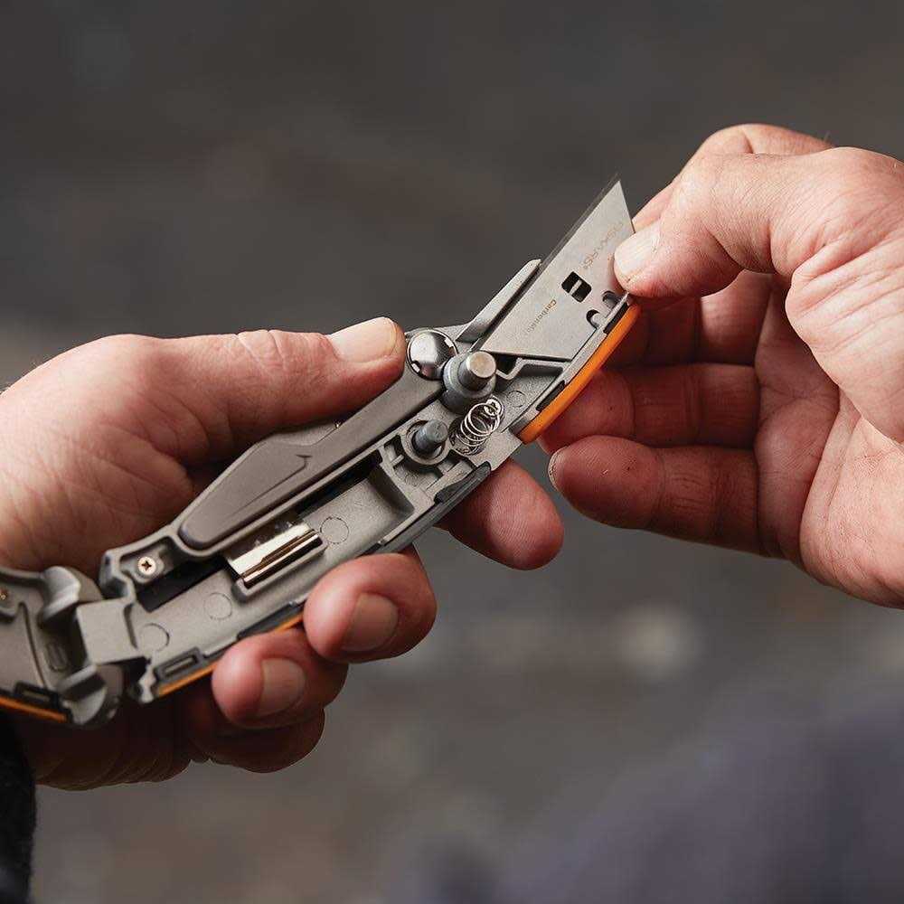 Keep your knife secure easily and simply with a Fiskars PRO fixed blade utility knife, featuring a unique folding blade guard. This knife holds the blade securely and firmly so there’s no wobble while in use. And, when you need to secure it you can do so worry free with the press of a button that deploys the guard. The knife hinges open while a magnet holds the blade in place for easy blade change. There’s no loose parts to disassemble so you can switch simply and quickly and there’s onboard storage capacity for five fresh blades. A reinforced metal end provides reliable resistance against pounding and drops. Includes one CarbonMax utility blade that lasts 24X longer than standard utility blades.