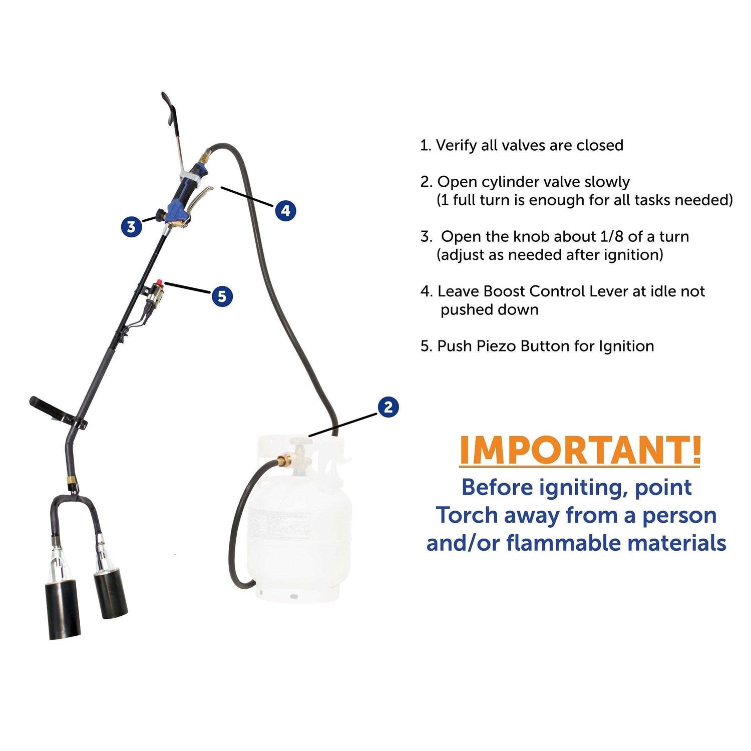 Get your job done 2X faster with the Flame King YSN1000K 1 Million BTU Dual Propane Torch! This torch is your perfect buddy to burn weeds at a faster rate, melt snow and ice, remove parking lot markings and paint, thaw frozen pipes and equipment, and melt tar and asphalt. Also used for torch roofing for waterproofing purposes. The plastic handle is ergonomically designed, making it comfortable to hold for long-term use, lessening the chance of slipping or dropping the torch. At 1 Million BTU and two large wide barrels, this torch is a great choice for any heavy-duty jobs around your home. A 16-foot hose is included to provide extra reach. The flame size can be controlled through the adjusting control valve. Use the Boost Control Lever to create a super flame. Comes with easy-to-reach single or dual auto-igniters that provide a constant flow of sparks making lighting this torch very easy. Works with standard liquid propane cylinders including 5lbs, 10lbs, 20lbs, 30lbs, 40lbs & 100lbs.Note: Propane cylinder not included.PLEASE NOTE that this is intended for Outdoor use ONLY. Also, do not use this torch to heat, mold, or bend plastic sheets, molding, or tubing. Carefully read all instructions from the manual before using your torch. Make sure to have all recommended safety gear assembled, such as goggles and heavy work gloves. It is advisable to wear close-fitting long sleeve shirts, pants, and boots to protect your limbs.