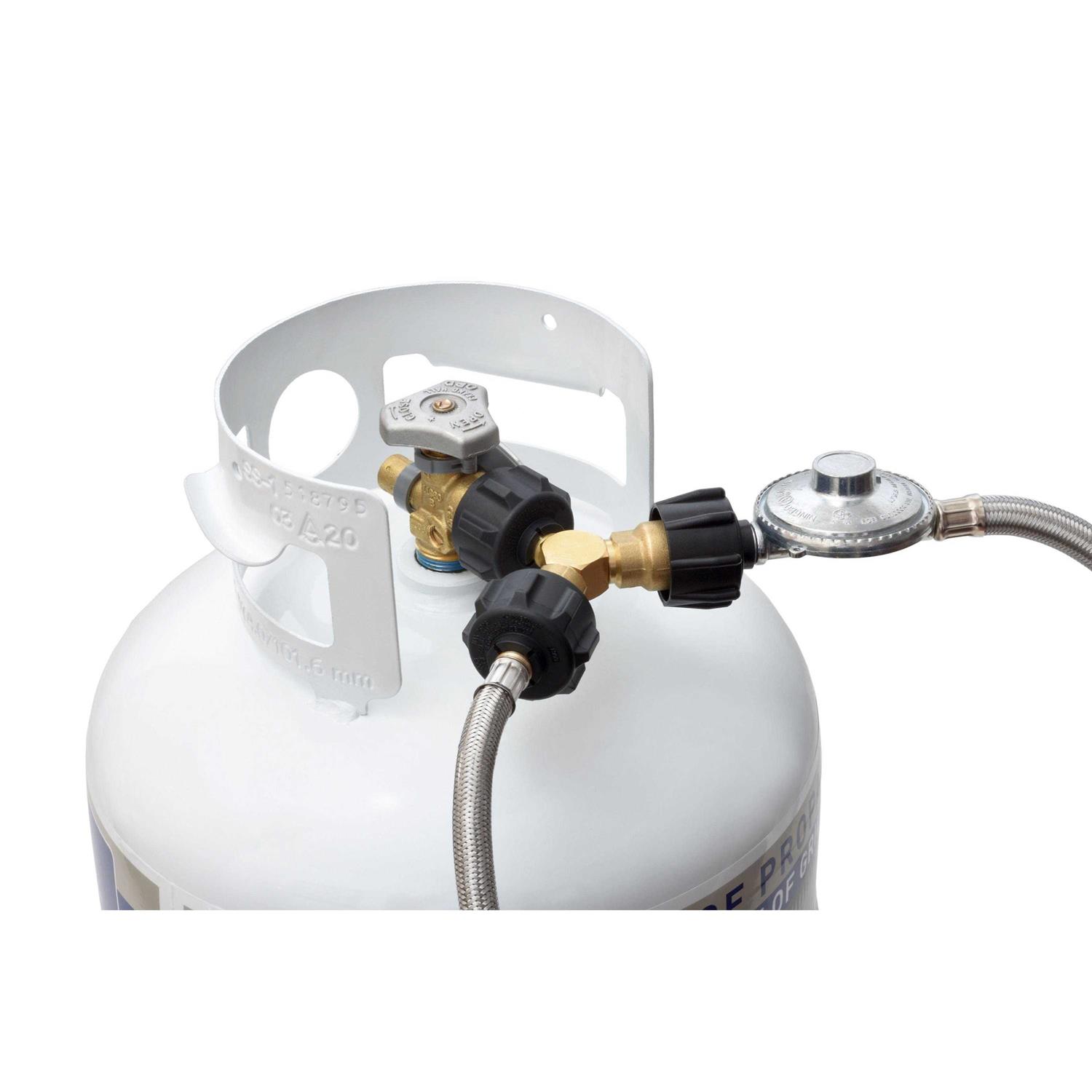 Flame King The Y splitter adapter easily allows for two different connections from one propane cylinder. Great for grills, lamps, and any other propane-fueled appliances. Multi-tasking with a single propane cylinder has never been this easy.