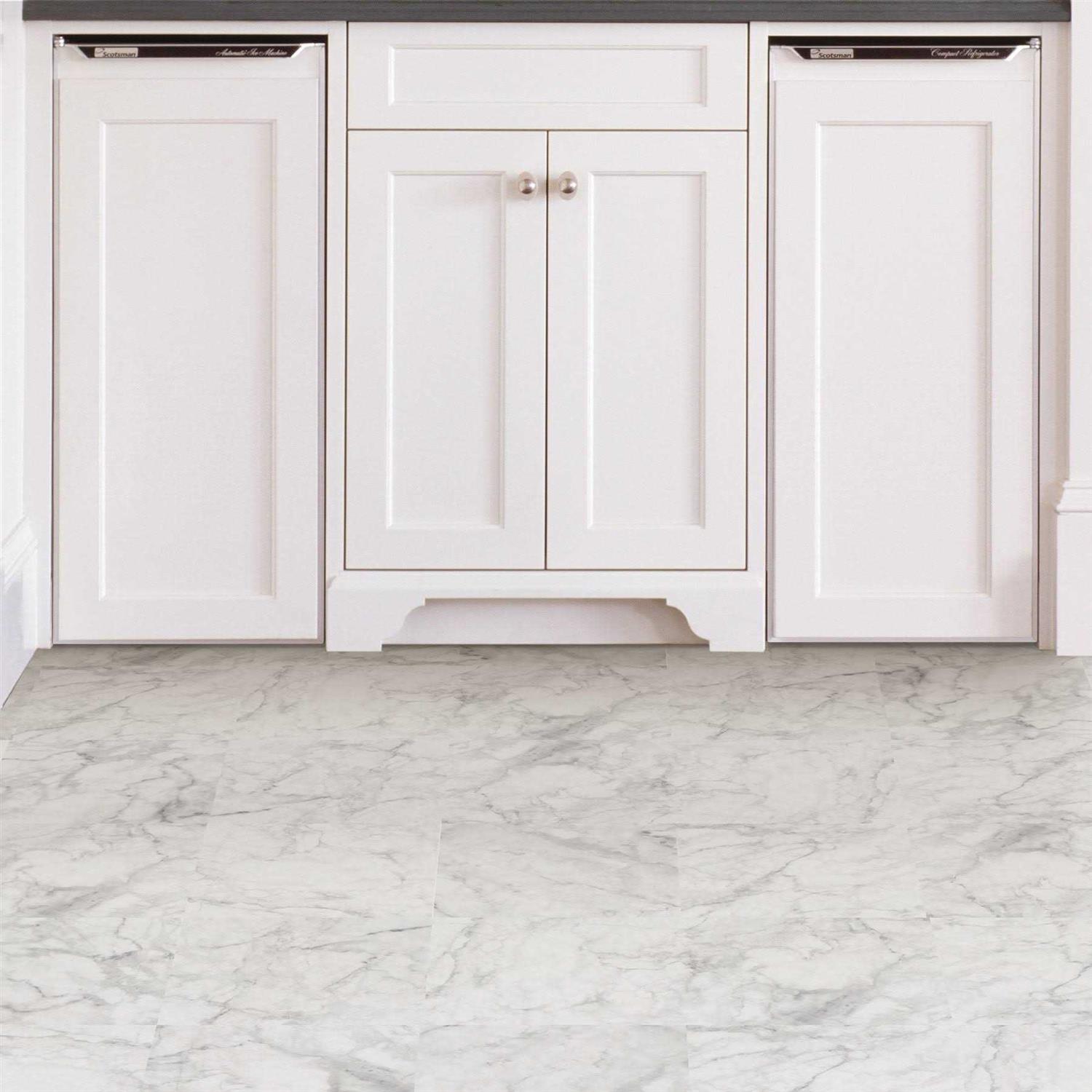 - Grey and white marble inspired peel and stick vinyl floor tile