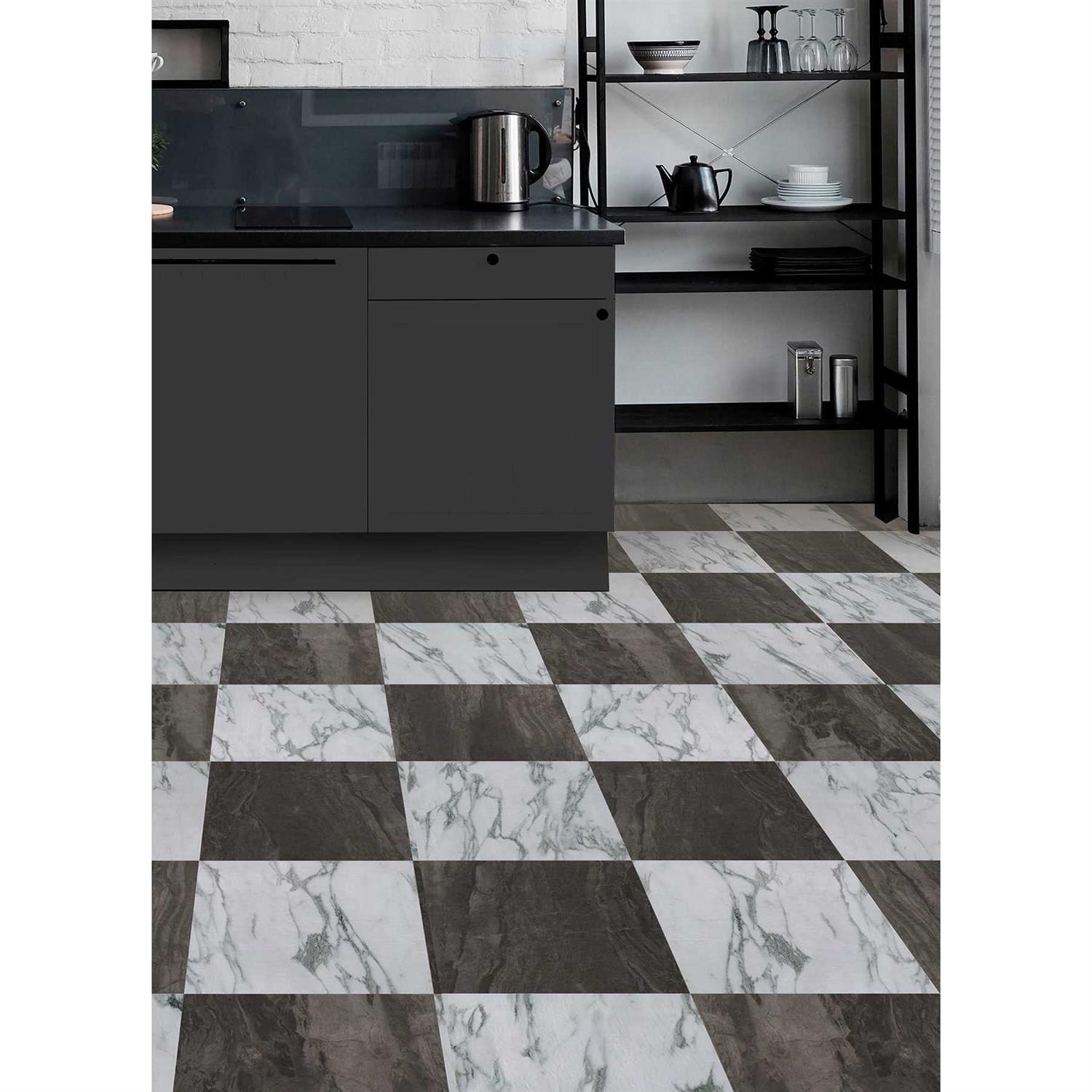 - Black and white marble peel and stick floor tiles create the perfect checkerboard opportunity.