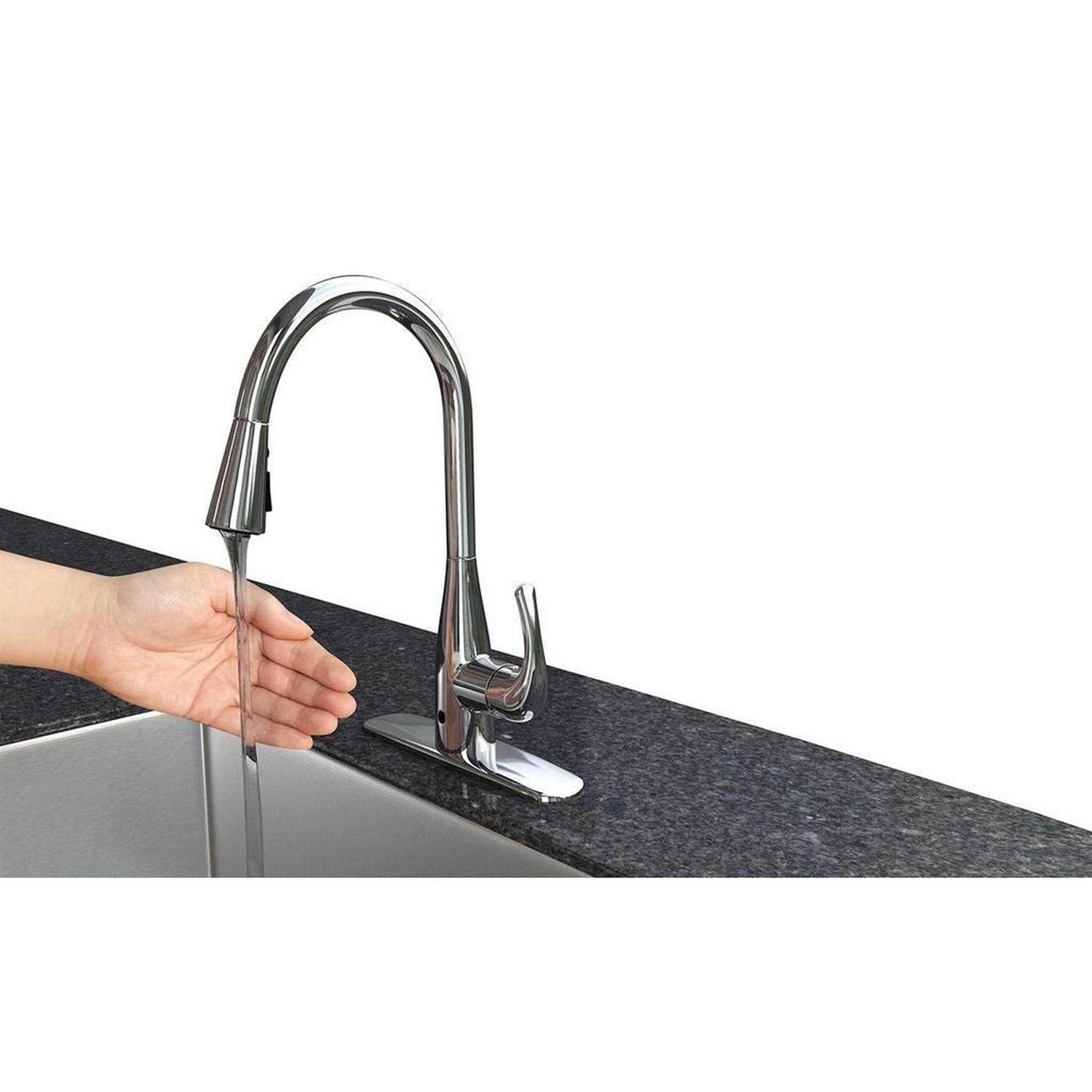 The simple and easy installation does not require any hard wiring but features a quick insertion method installation and since it is not hardwired it will be able to function normally even during a power outage. The FLOW faucet meets lead-free standards, a 2-function spray head, durable ceramic cartridge, metallic waterway, and an easy wipe clean finish. Easily swap between hands-free motion sensing mode or the option to use it as a traditional manual faucet. Pull down the faucet head to automatically spray and release to instantly turn the water off as the head retracts back into place on its own.