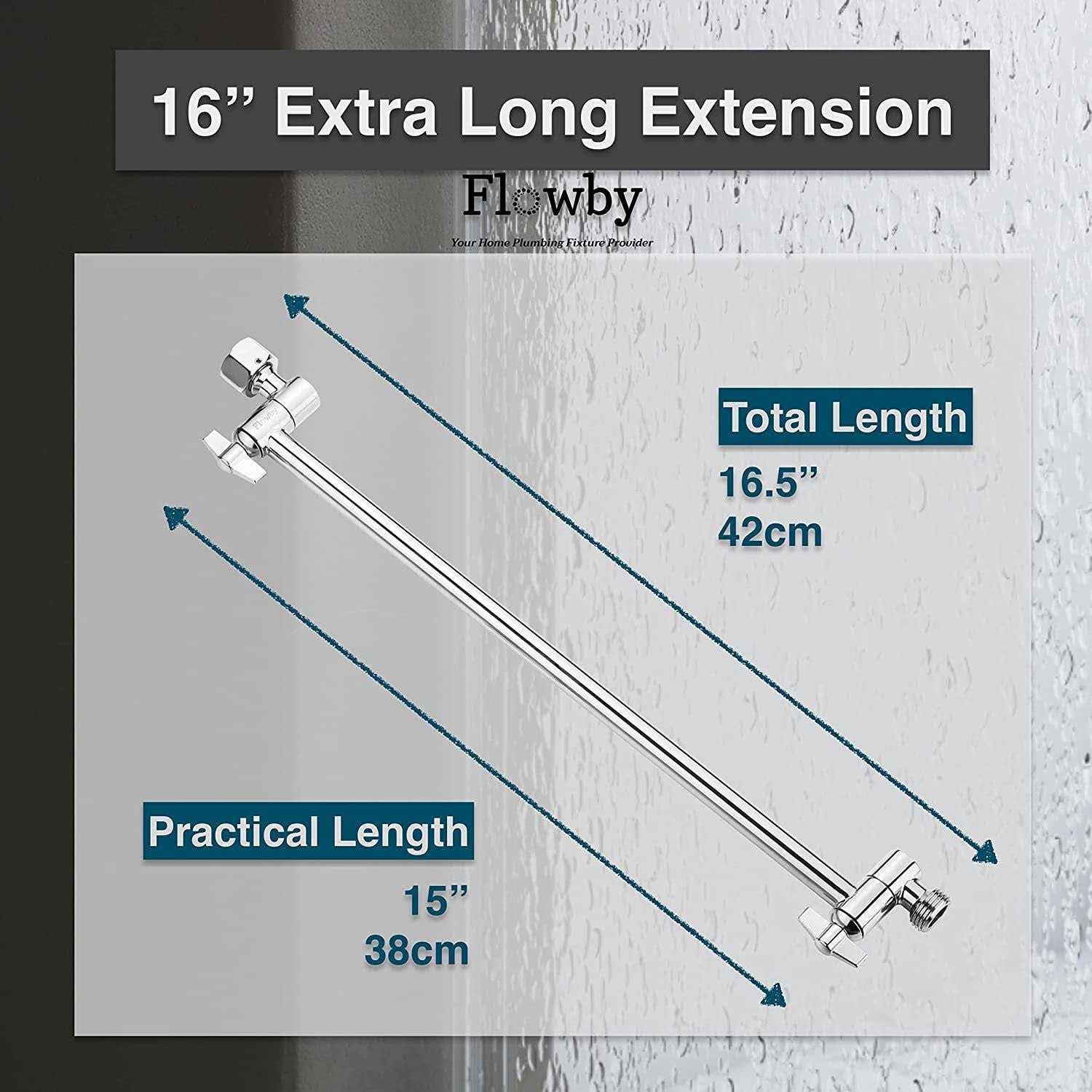Flowby 16” Extra Long Adjustable Solid Brass Chromed Shower Head Extension Arm, with Setting Screw and Locking Nuts, Extra Load of Weight
