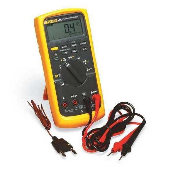 The 87-5 Calibrated DMM has improved resolution and accuracy to solve most problems related to electro-mechanical equipment. This enhanced model has a unique function for accurate voltage and frequency measurements on adjustable-speed motor drives and other electrically noisy equipment. It measures AC voltage (1000V), current (10A), frequency to 200 kHz and capacitance to 10,000 μF. A built-in thermometer allows you to take temperature readings conveniently without having to carry a separate instrument. The temperature probe allows measurements from -328° to +1994°F.The 87V digital multimeter is supplied with TL75 test leads, 80BK temperature probe, AC72 alligator clips, holster, 9V battery, Certificate of Calibration, manual and CD. The 1.38-pound unit measures 1.25″ x 3.41″ x 7.35″.