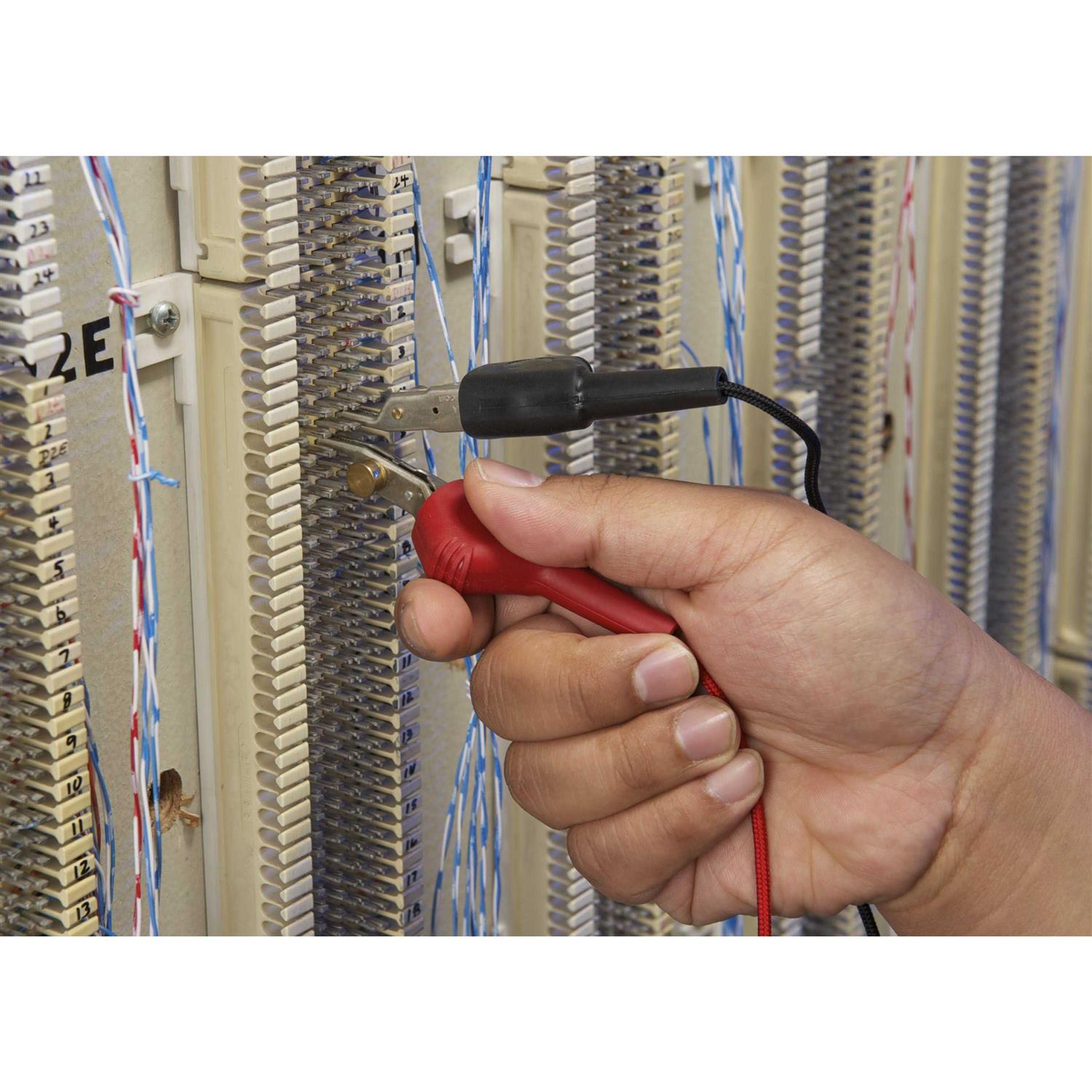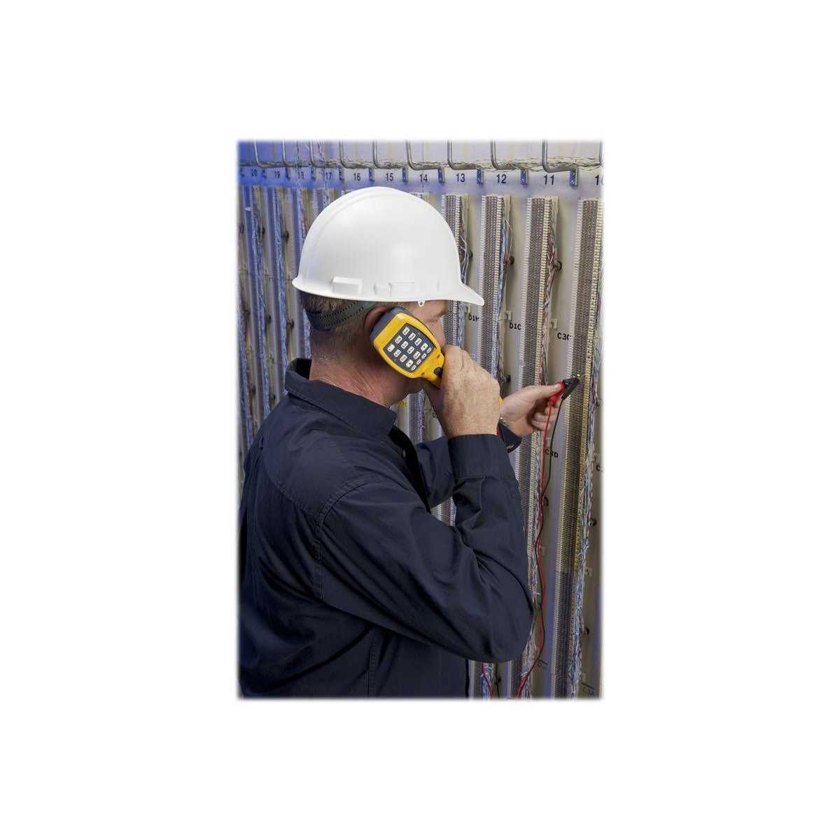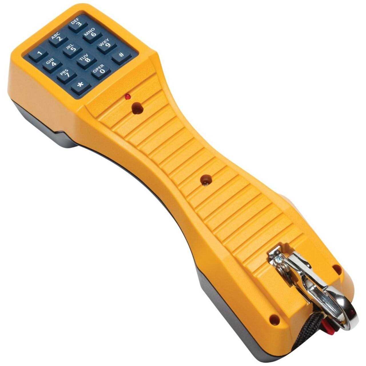 This test set was specifically designed for in-house telecom technicians. Its high impedance monitor prevents accidental disruption of service from clipping onto a data line while in monitor mode, thus ensuring the integrity of critical data lines. Features such as tone (DTMF) or pulse operation, talk/monitor capabilities, polarity test button and last number redial make this test set the perfect combination of features and price. The TS19 telephone test set, available with various line cord connectors to suit specific applications, is designed for in-house testing of telephone lines to detect dial tone and polarity, make and receive calls, monitor lines without disrupting service, and redial the last number called up to 18 digits, retaining the number for up to 15 minutes after disconnecting from a working telephone line. The test set provides tone or pulse operation and can be used to locate short and open circuits, and to verify continuity. It has an LED that lights red to indicate line polarity, and passes a 3.28-foot (1 m) drop test. The keypad has 12 standard dialing keys including star and pound, and a three-position slide switch allows selection of HI-Z mode for high-impedance monitoring without disrupting service, ring mode for low-impedance monitoring and detecting ringing voltage, and talk mode for dialing and talking. A belt clip at the base of the unit provides a secure hold on belt loops and D-rings. Additional specifications include various environmental operating conditions. Telephone test sets, also called butt sets, are used by telecom technicians to troubleshoot and maintain copper-wire voice-subscriber lines.