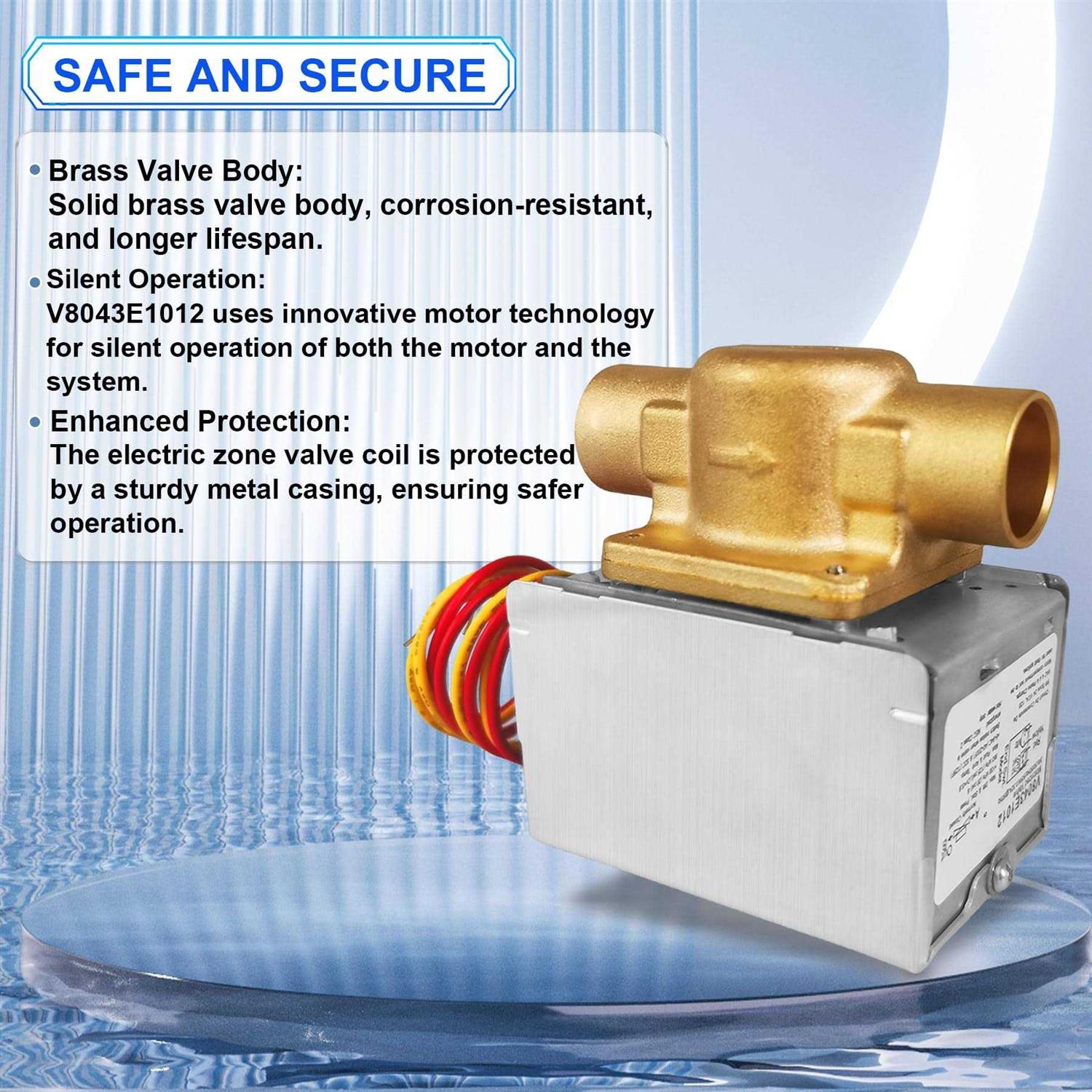 PREMIUM REPLACEMENT: The V8043e1012 valve is a perfect replacement for Honeywell zone valves, ensuring the stability of your heating system. V8043e1012 Motorized Valve is not just a replacement but also a high-performance choice, guaranteeing long-term stability for your heating system, providing warmth and comfort. ADVANCED FEATURES: This zone valve motor v8043e1012 features 2-wire thermostat control and an end switch, enabling intelligent control of hot water flow to maintain constant room temperatures. These advanced features allow precise control of the heating system, ensuring consistent indoor temperatures for a more comfortable living environment. ROBUST STRUCTURE: The V8043e1012 electric zone valve body is constructed from high-precision brass, resistant to deformation and oxidation, providing exceptional durability. This robust structure ensures a long lifespan and reliability for the valve, less susceptible to environmental influences. CONVENIENT INSTALLATION: Easily installed with just a screwdriver, no need to disassemble the valve, and the option to replace the power head or actuator motor without draining the system. This convenient installation method saves time and effort, reducing maintenance costs. Compact Construction for Easy Installation