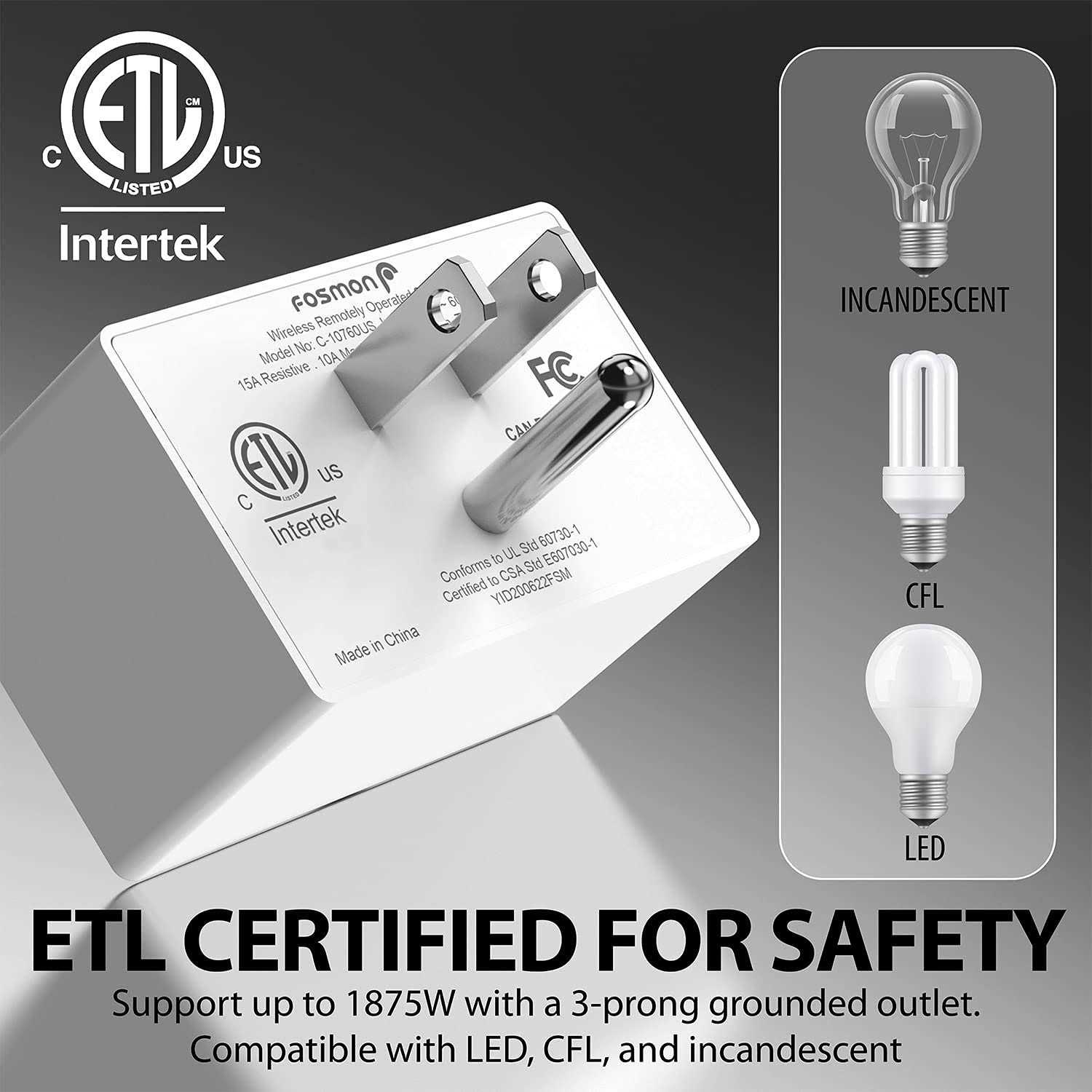 CONVENIENT WIRELESS LIGHT SWITCH. PROGRAMMABLE 80FT REMOTE CONTROL. SAFE FOR MULTIPLE USES. Wireless Outlet with a Wall Switch The Fosmon wireless switch allows you to easily upgrade your standard outlet to a remote controlled outlet by plugging in the wireless outlet receiver to an existing wall outlet. With this remote light switch, you can control lights, electronics, or small appliances in hard-to-reach areas. You can also mount multiple wall switches to any convenient spot, and never worry about losing the remote controls. 80FT RF Remote Control with Braille The RF remote can work up to 80 feet in an open area. When used indoors, it is able to work through walls and furniture. The remote control can be hand-held or mounted on the wall as a wall switch. With the large decorator style switch and Braille markings, it is user-friendly for the visually impaired. Compact Plug with ETL Certification Due to its compact and lightweight design, you can have the neighboring outlet available for other devices, or use two remote plugs on a duplex outlet. The safety of this remote outlet switch is certified by ETL. The plug is rated 125V 15A 1875W resistive, 1250W Tungsten, and 1/2HP. Easy Installation and Programming With this remote light switch, you are able to add a wall switch outlet without electrical wiring or hiring an electrician. You can mount the switch on a wall or place it on a table, letting you choose how you like to control your appliances. With the easy programming technology, you can set up a single pole, 3-way, or multiway switching in a few seconds. You can also turn on multiple lights with one simple click. The plug and switch are compatible with Fosmon indoor/outdoor remote control outlets, C-10683 and C-10741US.