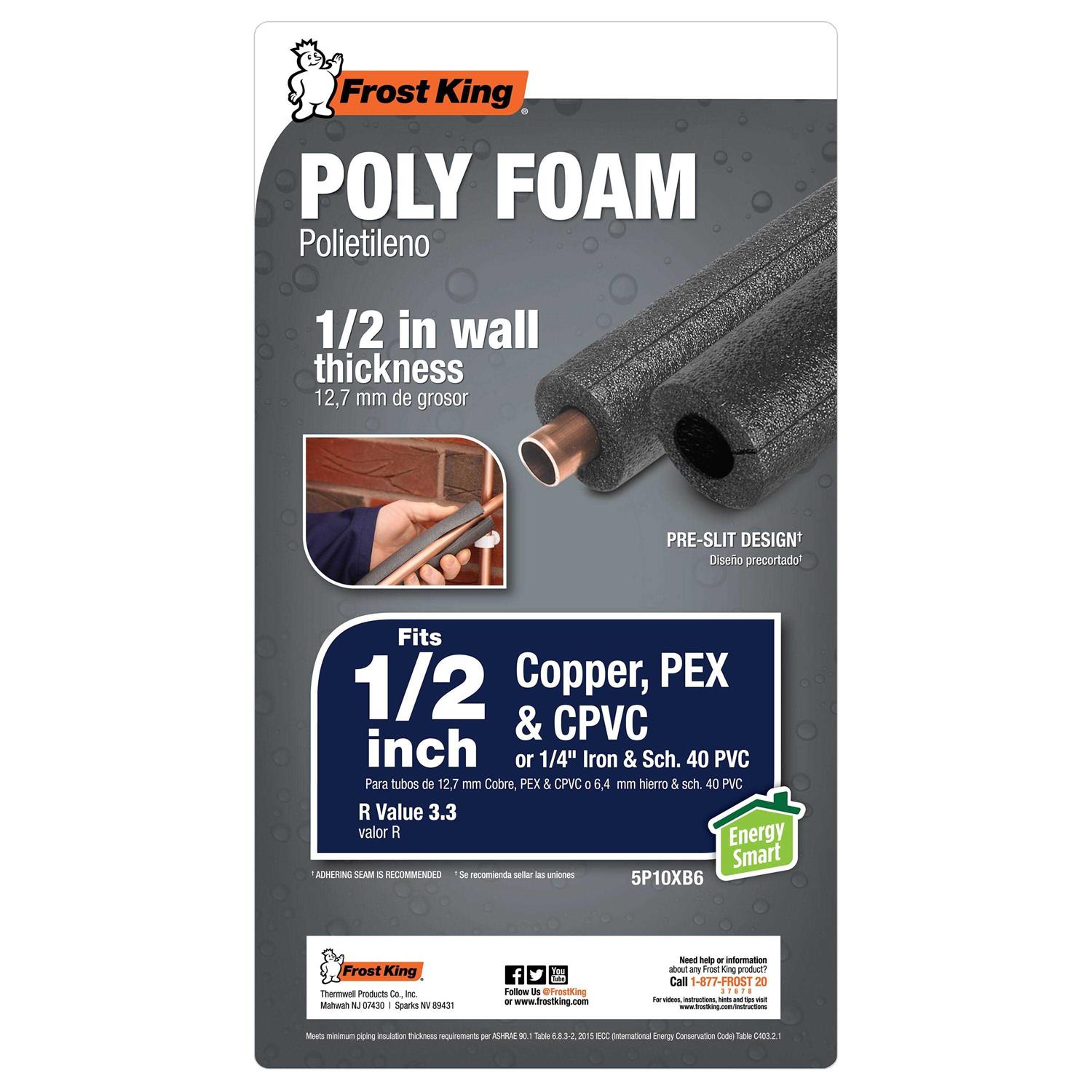 Frost King pre-slit polyethylene pipe insulation is used to retard heat loss on hot water pipes and to prevent freezing of all water pipes. It is ideal for residential applications, but can be installed in light commercial and light industrial projects. The insulation is 100% non-particulate closed-cell polyethylene foam.