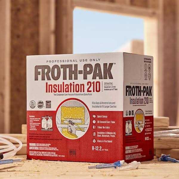 Professional use only. Froth-Pak Foam Insulation is a two-component, quick-cure polyurethane foam that fills cavities, cracks and expansion joints for insulation and air sealing. Froth-Pak Insulation has an R-Value of 12.2 when sprayed at 2 thickness. Froth-Pak Foam Insulation can be used in a wide range of industrial, commercial, institutional and residential applications in the United States. Froth-Pak Foam Insulation can be left exposed in non-fire-resistant-rated roof/wall junctures per National Fire Protection Association testing. Check Local building codes. Review all instructions and (Material) Safety Data Sheet before use. Always wear appropriate PPE.