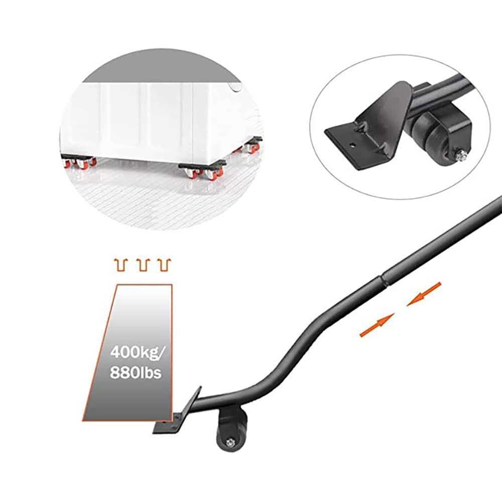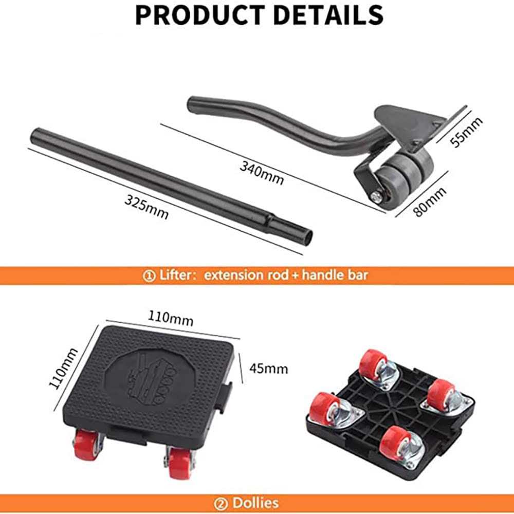 High-quality material: Made of durable ABS and steel, rust-proof, explosion-proof, and strong bearing capacity. Set Contents: Lifter, Furniture Cart x 4, the finished product does not need to be assembled. Holds and moves loads up to 400kg/880lbs. Easy to use: Extension rod: Makes it easier to lift large-sized heavy objects such as cabinets, wardrobes, sofas, etc. It is convenient to adjust the position of the pulley when installing the furniture; the hole of the handle makes it easy to hang and store. Wide range of uses: simple furniture mobile lifts, mobile carts can rotate sliders 360 degrees, and can be used to move heavy objects such as beds, sofas, refrigerators, dining tables, vases, desks, pianos, home/office supplies, etc. It is also a good helper for your cleaning. Strong carrying capacity: Wheeled furniture trolleys with rubber wheels, durable furniture trolleys – each furniture trolley has 4 wheels, a furniture moving tool that is easy to carry and store, a handy tool that allows you to easily lift your home heavy objects can be moved easily. Material: High carbon steel/ABS plastic /br Color: Black /br Size: /br Wheeled Crowbar – 34 cm/13.4 in L, 8 cm/3.2 in W /br Extension Pole – 32.5 cm/12.8 in /br 4 Wheel Cart – 11 x 11 x 4.5cm/4.3” x 4.3” x 1.8” /br Load Capacity: 400 kg/880 lbs /br Total Weight: 1.5 kg / 3.3 lbs /br /br The package includes: /br 1 crowbar /br 1 x Extension Rod /br 4 x Furniture Carts /br