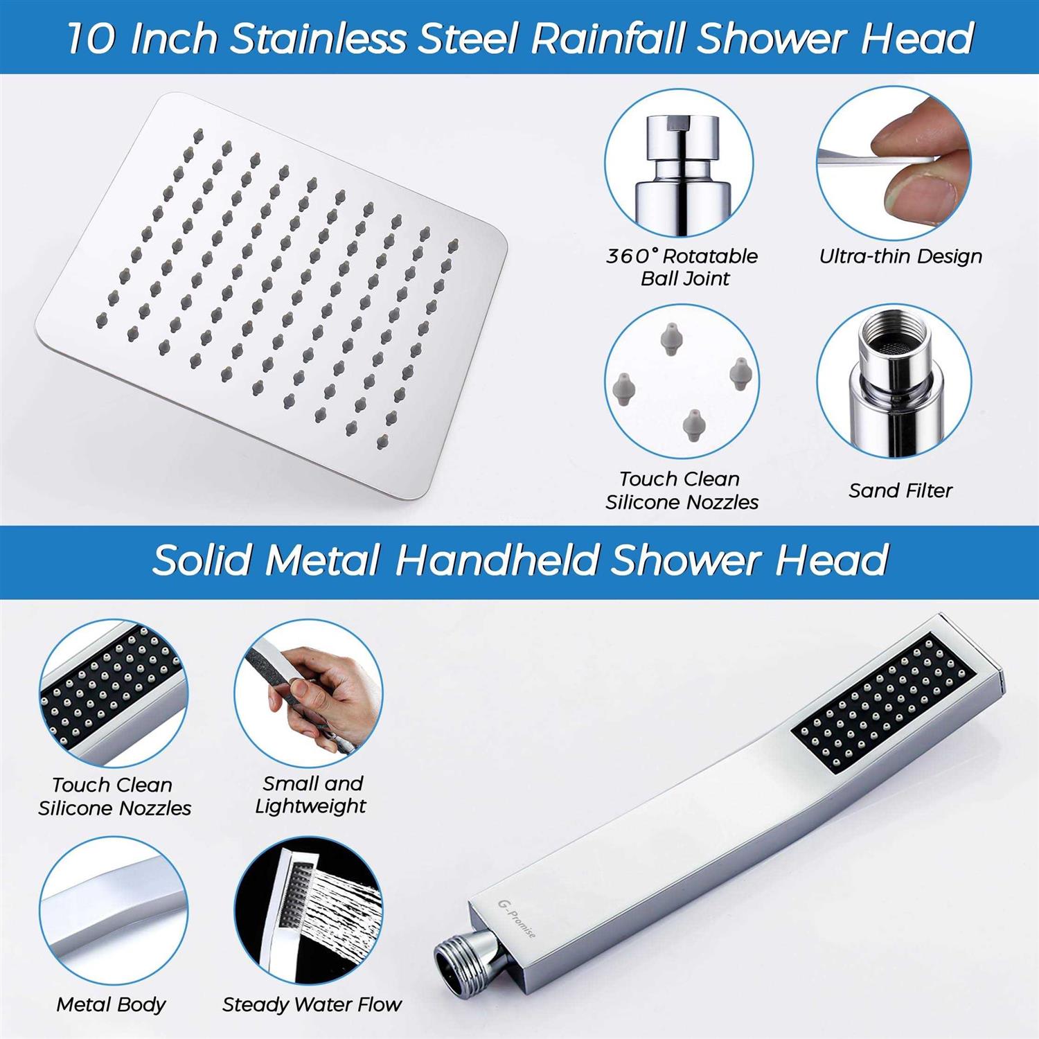 G-Promise All Metal 10 inch Rainfall Shower Head with Handheld Spray Combo| 3 Settings Diverter|Adjustable Extension Arm with Lock Joints |71 Inches