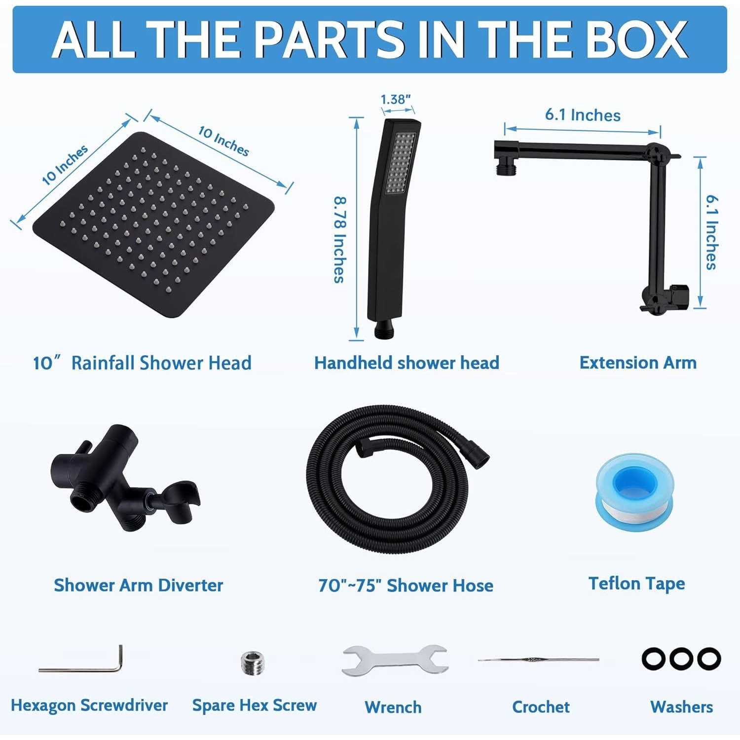 Handheld Showerheads by G-Promise. Details:This is a dual shower head set. – The rain shower head is 10 inches, which can provide you with a large-range shower. The handheld wand makes washing your little kids and pets with ease. – If you just want to wash your hair,the handheld helps water saving. Certainly you can choose use the rainfall shower head and wand separately or together. It is worth mentioning that the 13 inches flexible extension arm with a unique design. – You can adjust it with any height and angles you need. The free spinning locking collar allows you to tighten the extender in a correct position. About the 3-way diverter and 71 inches long hose. – The diverter convert water from rainfall shower head and handheld conveniently.71 inches long hose keeps you away from winding or tangling. The hose can be stretched from 70” to 75”, which means you have a longer shower distance. – This set is all metal construction which is more duarble.