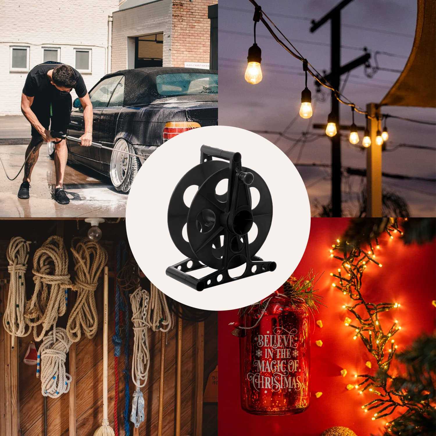 Cord Reels by GarfatolRv. Details:GarfatolRv Cord Storage Reel with Handle Driven Easy to Use with Carrying Bag [Durable Construction ]: Made of high-quality impact-resistant plastic materials, lightweight and durable, and can be exposed to high-intensity light. [Wide Application]: It can accommodate up to 150 feet of 16/3 cords or 125 feet of 14/3 cords, which is very suitable for storing extension cords, holiday lights, ropes, hoses and other items that are difficult to store. [Convenient and easy to use]: Lightweight design with handles for easy transportation. The center handle can realize smooth winding movement. [Product size]: 14.49 x 11.34 x 7.8 inches.