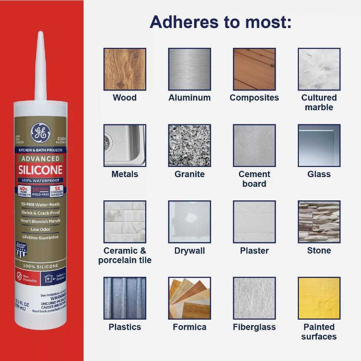 GE Advanced Kitchen and Bath sealant is a high-performance,100%siliconeand100% waterproof sealant ideal for areas prone to water exposure. GE Advanced Kitchen and Bath sealant is permanently flexible with 40% more flexibility than Class 25 sealants and has 5X stronger adhesion than our sealant. It will not discolor most high-end metal finishes such as chrome, bronze, and nickel. This sealant also has a low odor while curing thanks to its neutral-cure formula. Its 30-minute water-ready formula offers 10-year mold-free product protection to protect against mold and mildew growth. Use our silicone kitchen and bathroom sealant on a variety of common surfaces, including most metals, plastics, and woods; glass, drywall, plaster, granite, and more.