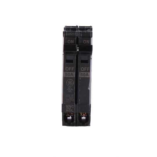 Double-Pole Circuit Breaker features a case made of heat-resistant thermoset for stability and structural integrity. The breaker unit has tin-plated copper stabs to create reliable, permanent and corrosion-resistant connections and a dedicated calibration screw that is cemented to prevent shifting and create a stable calibration for optimum performance. Tin-plated copper stabs create reliable, permanent and corrosion-resistant connections. THQP breakers are a smaller, smarter solution for today’s cost and quality-conscious contractors and homeowners. Half the width of standard breakers, they allow use of smaller load centers and for maximum savings of space and money. GE is the only manufacturer that gives you this cost advantage without sacrificing flexibility. THQP breakers are one-half the width of standard GE breakers but identical in design. They are available from 15 to 50 amps and in single and two pole construction. Trip Style: Non-Interchangeable. Frame Type: Q-Line. Amperage: 50A. System Voltage: 120/240 Vac. Poles: 2.