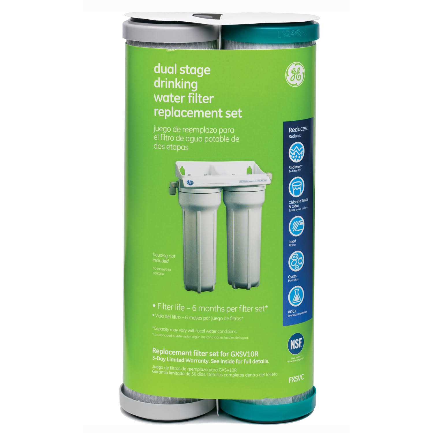 The GE FXSVC water filter produces healthier and better-tasting drinking water and cooking water. The GE FXSVC under sink water filter reduces VOC’s, mercury, lead, cysts, chlorine taste and odour, asbestos, and turbidity. The GE FXSVC water filter also reduces sediment and rust particles. The GE FXSVC under sink water filter set includes one pre-filter double open end carbon block filter with grey end caps and one double open end carbon block post filter with green end caps. The filter with grey end caps should be installed in Stage 1 followed by the filter with green end caps in Stage 2.