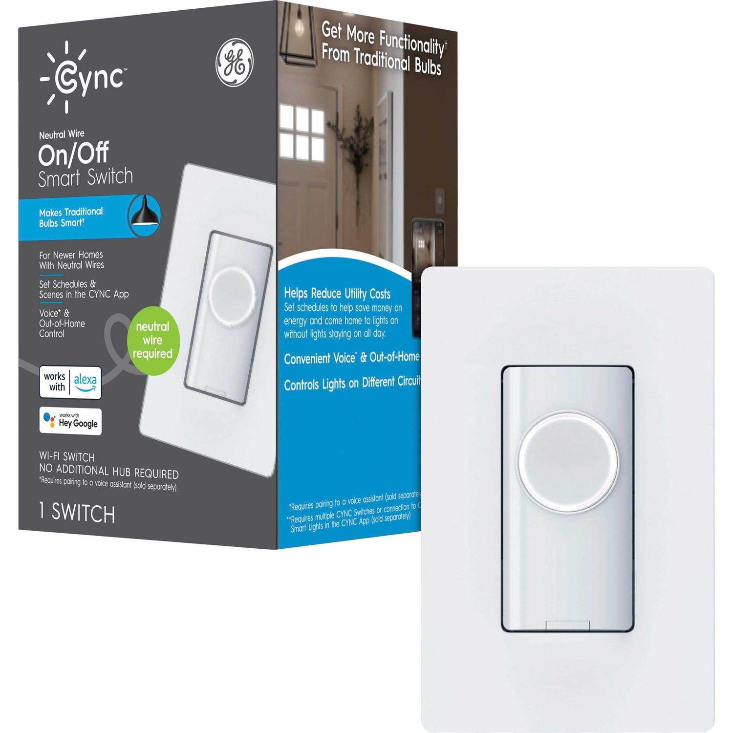 The C by GE On/Off Smart Switch-Paddle adds smart bulb functionality to traditional bulbs and keeps smart bulbs smart. The classic design blends seamlessly with other paddle switches. The smart Wi-Fi switch adds out-of-home control scheduling and scene-setting to traditional bulbs. When C by GE smart bulbs is installed the smart switch allows app or voice control even when power is turned off at the switch. Pair the Smart Switch with C by GE Smart Bulbs in other fixtures like table lamps and control all your lights in the room from one wall switch. C by GE On/Off Smart Switch wirelessly connects with other C by GE Smart Switches so you can control the same light fixture from multiple switches without a travel wire even if the switches are on different circuits. Simple DIY set up. The Smart Switch connects directly with Google Home and Amazon Alexa devices without a hub required. Neutral wire–usually a white or gray wire–is required.