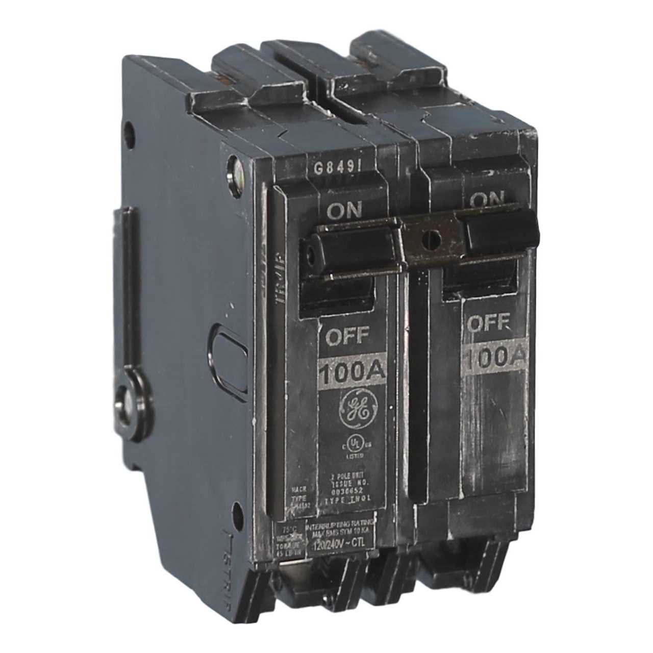 Copper-to-copper connections, calibrated for optimum trip performance, heat resistant thermoset cases and covers, cemented calibration screw. This 120/240 V GE 100 amp, double pole, thick series replacement circuit breaker is used in a General Electric load center and/or used for feeding sub-feed panel boxes.
