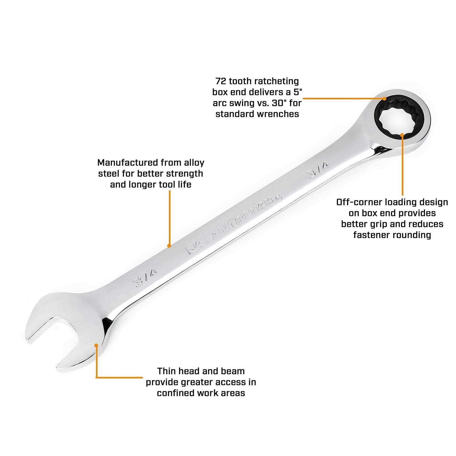 - The end of the GearWrench 72 tooth ratchet box requires a minimum of 5° to move fasteners relative to 30° for standard wrenches