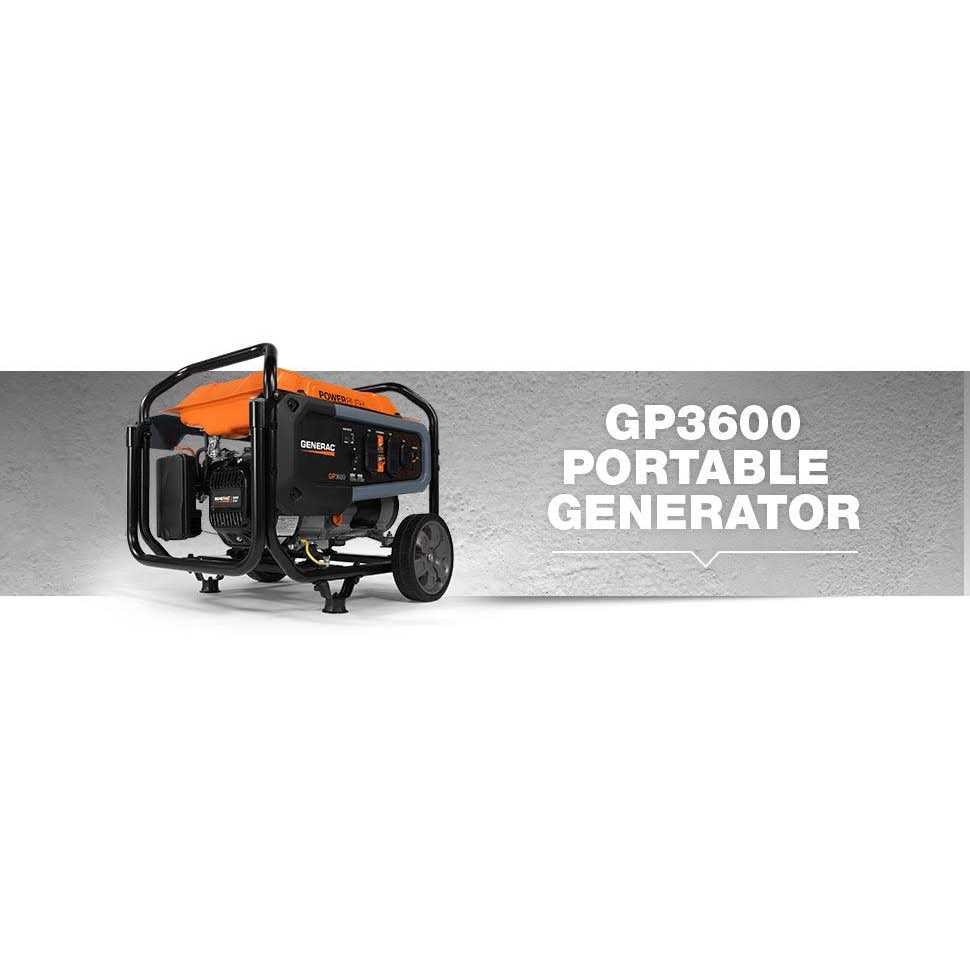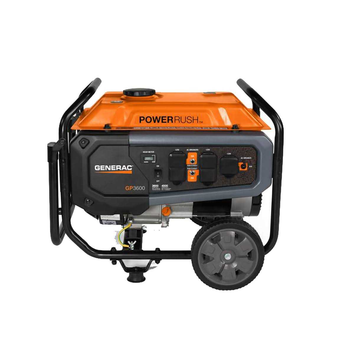 The 3600 Watt Generac GP3600 portable generator can be used to tackle home projects, provide power for tools, or deliver essential electricity in the case of an outage. It is an especially affordable solution with premium features. These include PowerRush advanced technology delivering over 40% more starting capacity an OHV engine for longer engine life and a large-capacity steel fuel tank with an incorporated fuel gauge for durability. The hardened steel tube cradle provides added strength, while the low-oil level shutdown protects your engine from damage. Heavy-duty, never-flat wheels and a towable handle make for easy transportation of the generator. The compact size of the GP3600 ensures it will take up minimal storage space in the garage.