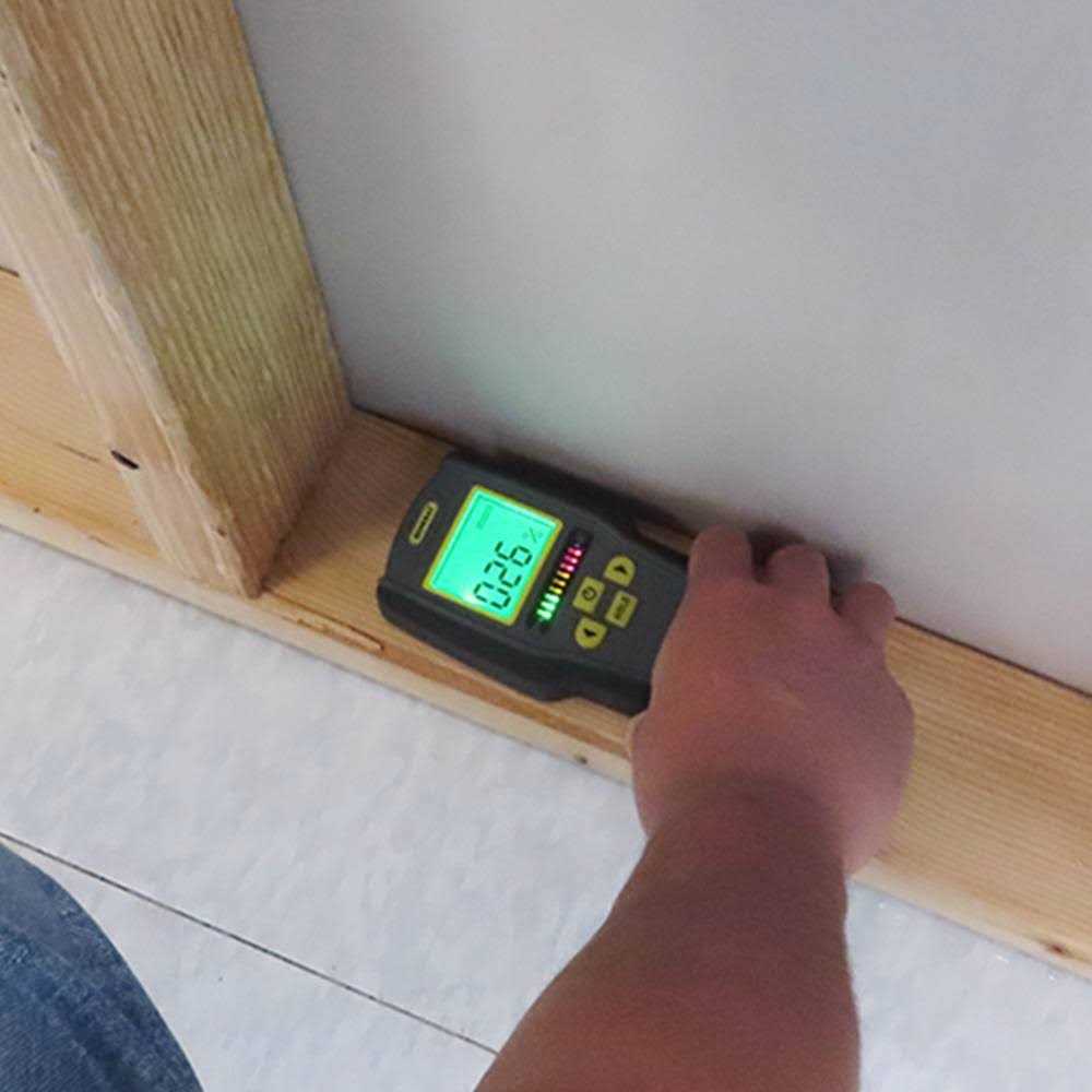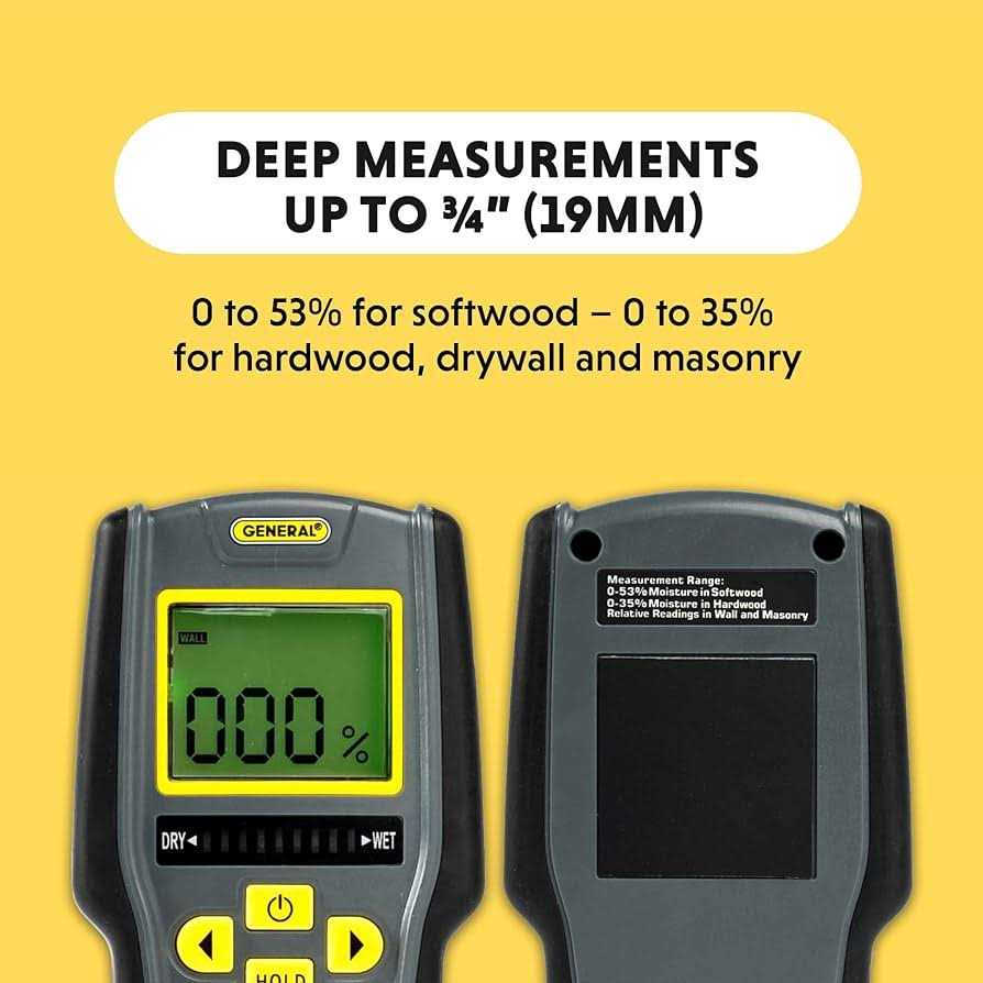 - Features include a HOLD button for keeping measurements and out-of-range alarm for moisture dense materials