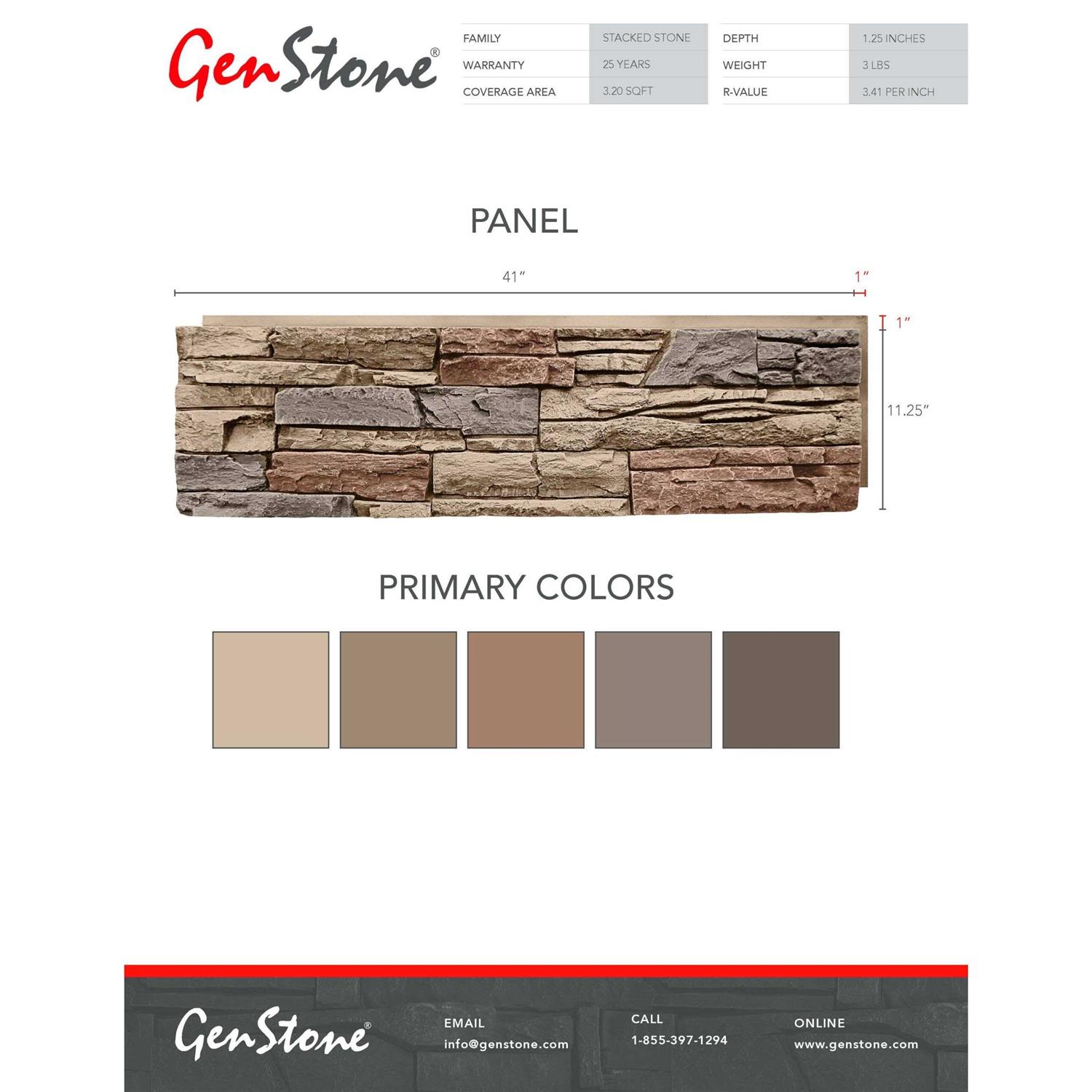 DescriptionGenStone stacked stone veneer profile offers the natural appearance of authentic dry stacked stone, but without the weight and the difficulty of installing real stone. This product is panelized to provide a dramatic texture and aesthetically appealing design, which is ready to be installed from the box to the wall in minutes using screws and common tools. The unique interlocking joints of the panels provides a seamless application while installing 3.20 sq. ft. of coverage per panel results in fast project completion. A GenStone panel stands 12 in. tall (11.25 in. of coverage) and stretches 42 in. wide (41 in. of coverage). These lightweight panels weigh only 3 lbs. each and provide an R-value of 3.41 per inch. Do-it-yourselfers will appreciate the year round ease of installation and the enhanced curb appeal of your home or building. A variety of accessories are available including ledgers, inside corners, outside corners, inside corner ledgers, outside corner ledgers, left and right finished edge pieces and trim to provide an effortless professional finish. GenStone stacked stone veneer panels are cast from real stone into our proprietary molds. These molds were created using the unique patterns of individual stones as they’re found in nature. Each panel is made by compressing a combination of polyurethane and additives into a durable wood-like material before it is hand painted with 12 coats of premium exterior paint.