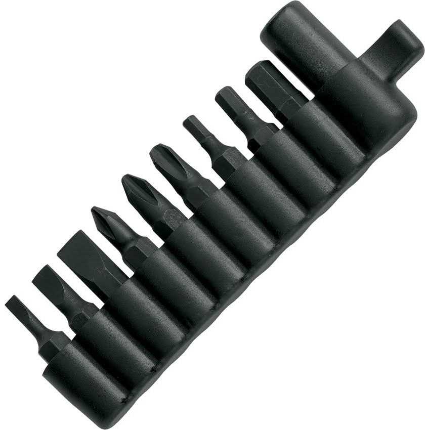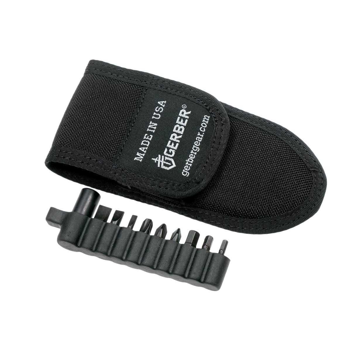 This accessory increases the versatility of all Gerber multi-function tools. The tool kit has a coupler that fits over the crosshead screwdriver, allowing the use of any standard 1/4 inch hex bit. Almost all fasteners have drivers in the 1/4 inch hex bit format. Gerber was the first to offer such a coupler with a multi-functional tool, and it’s still the best one on the market. It comes with the coupler, six bits (three flat head drivers and three crosshead drivers), a coupler/bit carrier, and a ballistic sheath to hold a Multi-Plier and the loaded coupler/bit carrier. The tool kit will work with any Gerber multi-function tool.