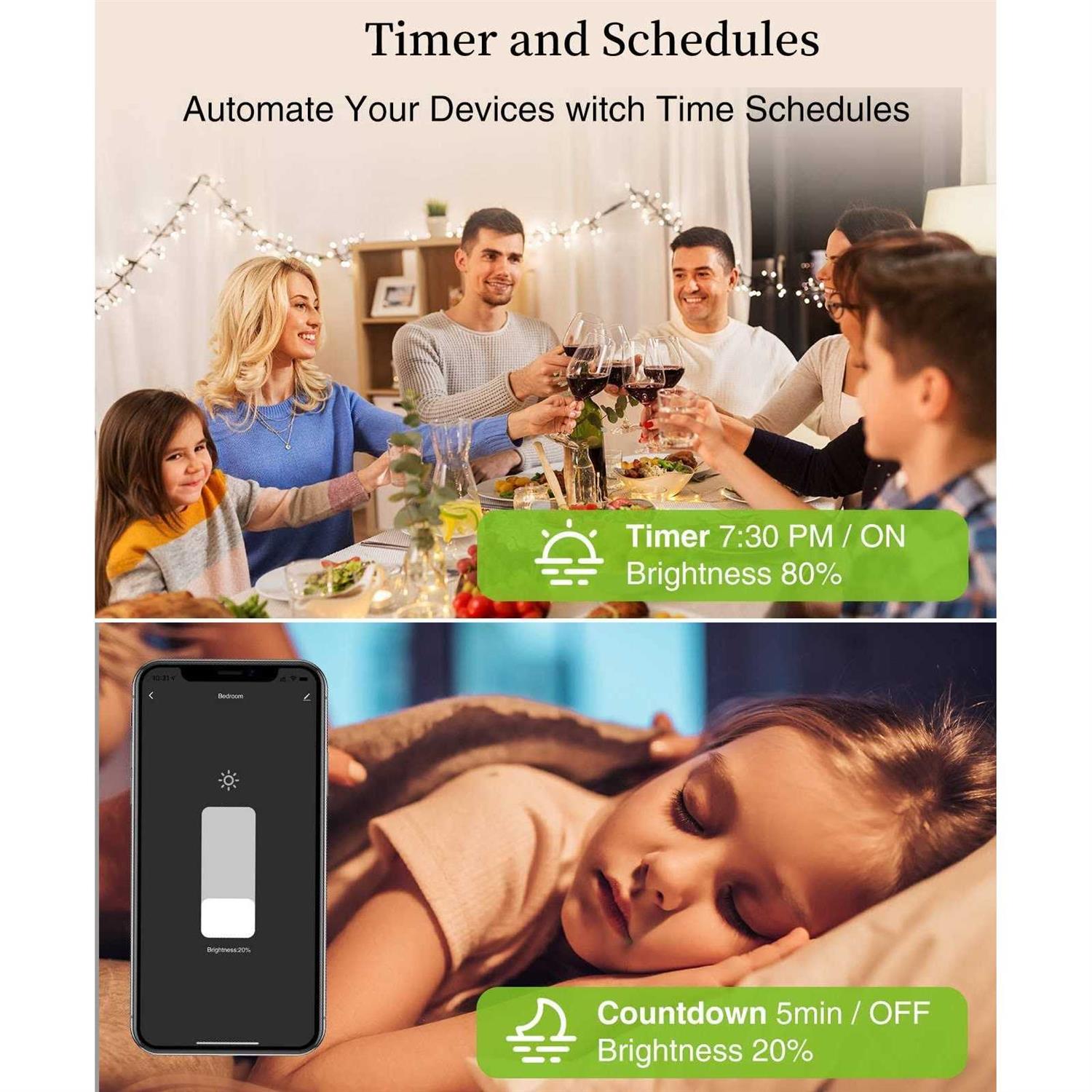This smart dimmer switch has an elegant touch dimming interface that looks wonderful on the wall. Best Gift for Valentines Day Equipped with sensitive touch panel, simply touch slide your finger on the panel to adjust the brightness of multiple light bulbs or the fan speed on dimmer light switch. Adjust brightness from 1 100% to cut energy costs and extend bulbs life. You can create scenes with the desired brightness when having dinner with your family, watching movies,having a talk or reading a book. Set the perfect ambiance light for any activities. Dimmer switch also remembers the light setting even after a power interruption. You can also create a group for all your smart plugs, smart bulbs and smart switches ,then control them all with one voice command. Set up wifi dimmer switch to turn on and off based on your daily schedules and preferences. With the dimmer switches, you can create your personalised smart scenes to adjust your home lighting automatically to sunset and sunrise times. 1. Download App and installation. 2. Open the App and create your account. 3. Add the device from the upper right conner Tap”+” and select “our switch”. 4. Set your WIFI connexion follow the APP instructed. 5. Press any one of the ON/OFF buttons for 5 seconds and wait for the LED indicator flashes fast, the reset is successful. EZ mode is available and wait for connected. 6. Or when fast flashing, then press any one of the ON/OFF buttons for 5s,the LED indicator become blinking slow. AP mode is available and choose “SmartLife-XXX” hot spot, then connected. Wait for the connexion till successful. Note:When the socket changed network environment, you need to restore the factory settings, and then reconnect to the network.