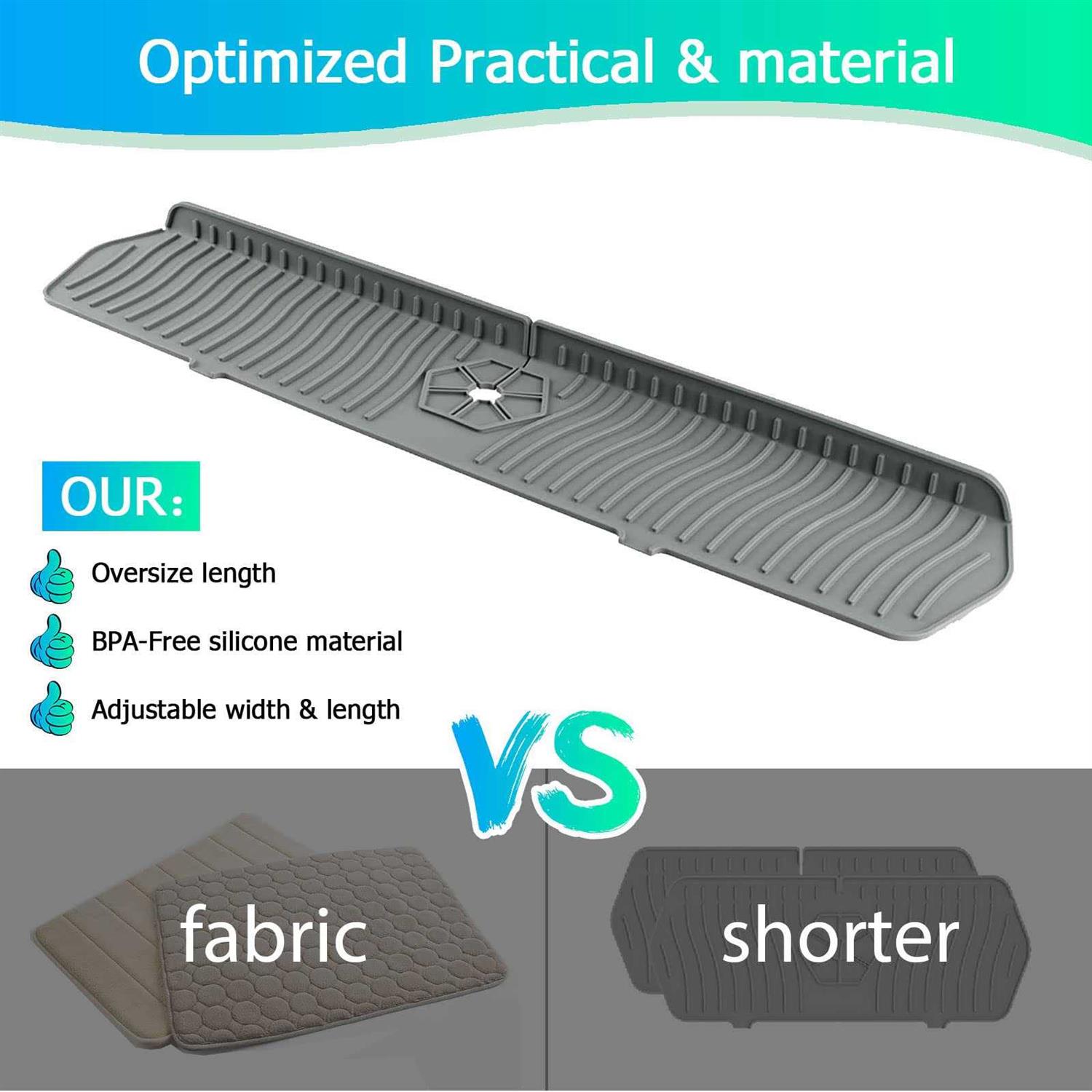 100% Silicone Experience a cleaner, more efficient sink with oversized kitchen sink splash guard by GigaBaskets! Say goodbye to the problem of water and sticky residue building up at the base of your faucet. GigaBaskets sink protectors for kitchen sink can catch most drips and direct water flow into the sink, reducing the need to wipe down your counter-tops frequently. Looking for a customizable solution for your kitchen sink? Look no further than our extended-size silicone sink splash guard! Measuring at 24″ x 5.64″, Ø 2.5″, it fits snugly around most single faucet diameters, and the adjustable side allows for full customization to fit your kitchen sink perfectly. What’s more, its adaptable design also makes it suitable for use on kitchen countertops, central islands, bathroom sinks, and RV faucets. Looking for a reliable and practical assistant in the kitchen? Look no further than our silicone sink faucet mat! Made of BPA-free silicone that is safe for food contact, it’s the perfect tool to help keep your sink area clean and efficient. This silicone sink mat features a soft, waterproof material that efficiently captures water drops, providing effective help for a comfortable kitchen or bathroom sink area. Looking for a versatile tool for your kitchen and bathroom? Look no further than our oversized splash guard for sink! Featuring a wavy pattern design and two water outlets, it effectively directs water drops into the sink and also doubles as a sink drying holder. Its generous size provides ample storage space for various small items such as kitchen sponges/ dish soap/ cups/ brushes/ bottles, bathroom facial cleanser/ razors/ toothbrush holders, and more. Say goodbye to a wet fabric or short mat with our easy-to-clean kitchen sink splash guard. GigaBaskets faucet mat can be machine-washed and dried or simply wipe it down with water. Experience a cleaner, more efficient sink with oversized kitchen sink splash guard by GigaBaskets! Say goodbye to the problem of water and sticky residue building up at the base of your faucet. GigaBaskets sink protectors for kitchen sink can catch most drips and direct water flow into the sink, reducing the need to wipe down your counter-tops frequently.