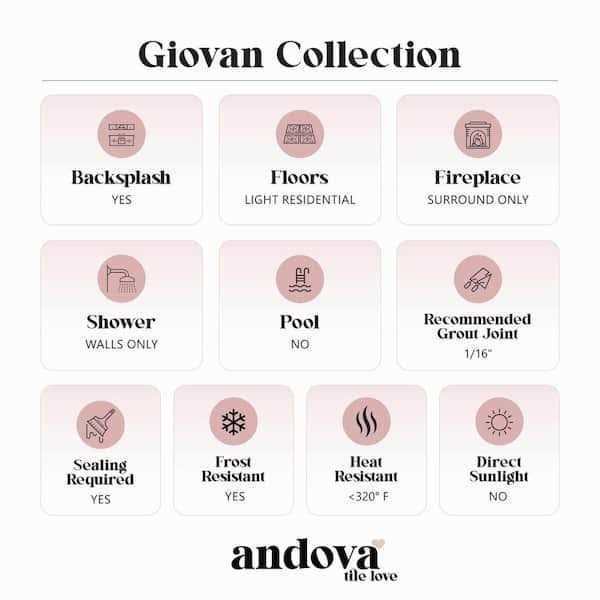 Andova’s Giovan mosaic tile collection blends contemporary style with timeless appeal. Choose from six variations of exquisite color shades. The classic brick style will bring symmetric beauty into your living spaces. Each rectangle tile has a unique marble pattern that will blend in and enhance the surrounding interior.
