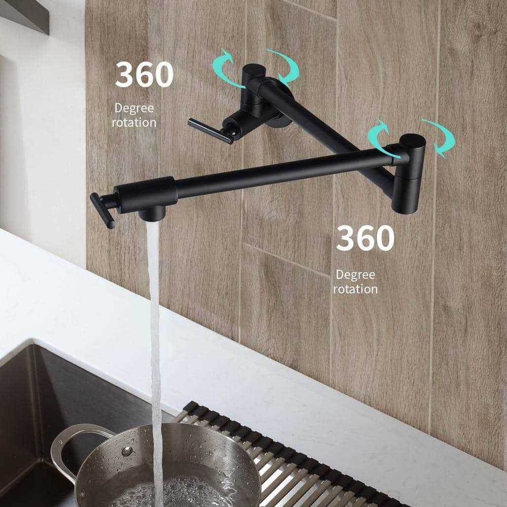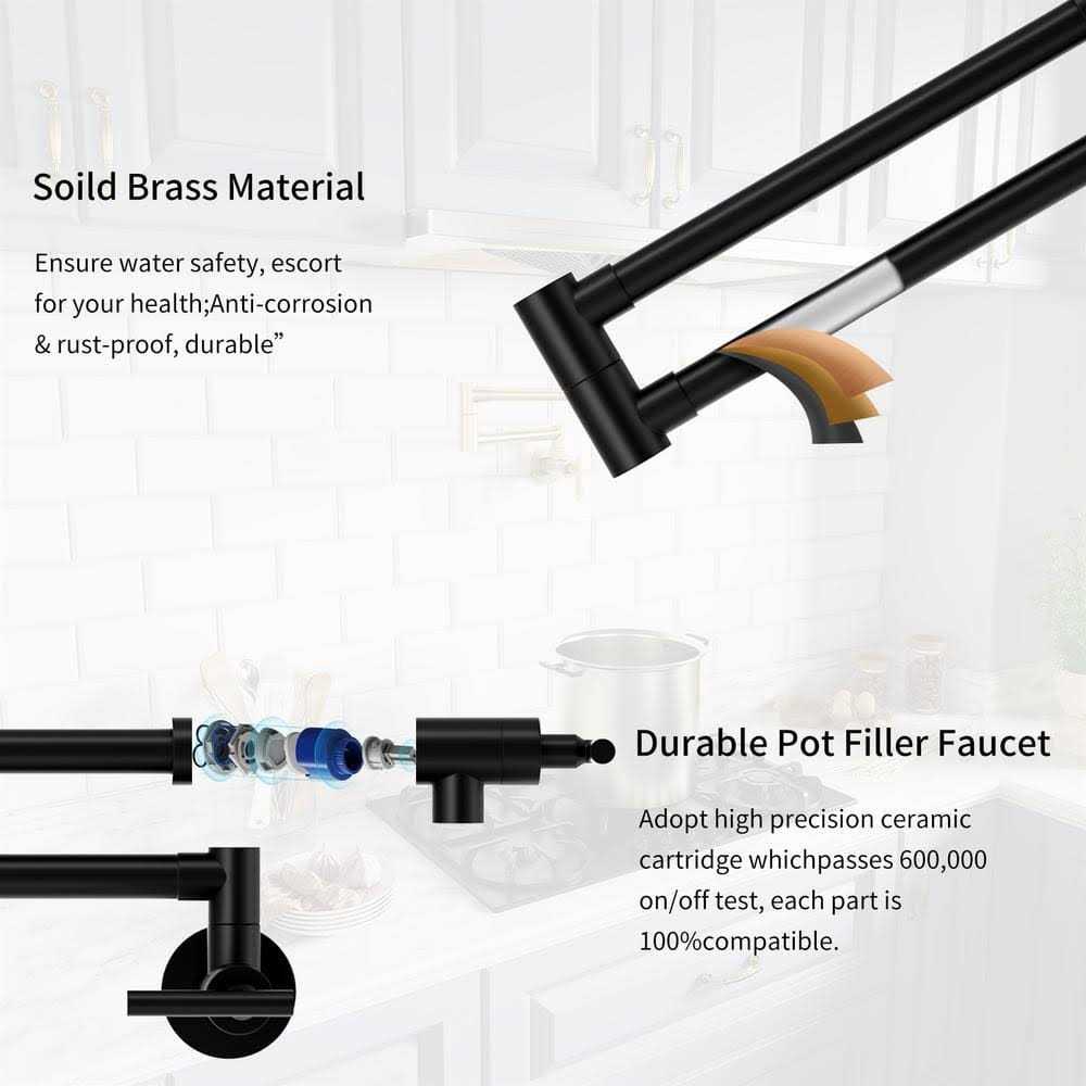 Filling pots on the stove has never been easier or more affordable, thanks to the new Giving Tree Pot Filler faucet. This farmhouse Pot Filler features a wall-mount, dual swing joint design with dual shut off valves and a 2.2 gpm flow rate to match daily use. A pot filler makes it easy to fill cooking vessels quickly and without the walk from sink to stove. Built using steel and brass the cUPC certified pot filler delivers reliable durability, convenient articulation and long-lasting performance. Color: Matte Black.