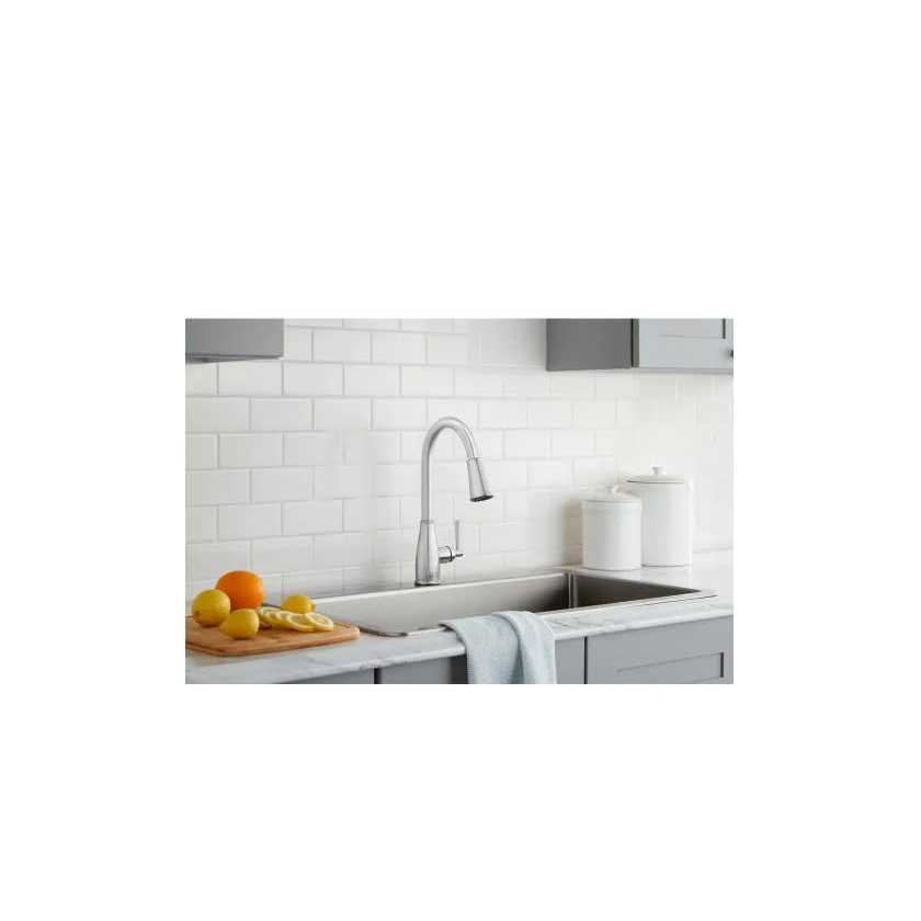 The Fairhurst Single-Handle Pull-Down Sprayer Kitchen Faucet in Chrome offers a sleek style that will complement any decor. Easy-to-use with a single handle design, this faucet has a convenient pull-down spray wand with 2-spray modes and a long reach that makes easy work of kitchen tasks. The pull-down sprayer features an aerated spray and a new TurboSpray that is exclusive to Glacier Bay. Featuring a ceramic disc cartridge for drip free performance, the 1.8 GPM flow rate also provides excellent water pressure for your cleaning needs. This kitchen faucet also includes the exclusive FastMount mounting system to make installation quicker and easier.