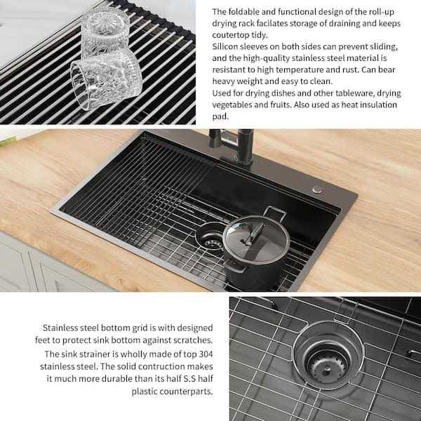 Experience cutting-edge kitchen technology with the Glacier Bay Gunmetal Black Stainless Steel 18-Gauge Kitchen Sink. This sink is crafted using innovative PVD and Nano technology, resulting in a durable and long-lasting coating on high-quality stainless steel. The gunmetal black kitchen sink complements any decor and offers exceptional functionality. It’s meticulously handcrafted with premium 304 series stainless steel and comes fully undercoated with a multi-layer sound-eliminating pad that also prevents condensation. It boasts a commercial-grade premium scratch-resistant PVD nano finish. Rest assured, all our kitchen sinks are guaranteed never to rust. Plus, it comes with an elegant and functional solid metal strainer.