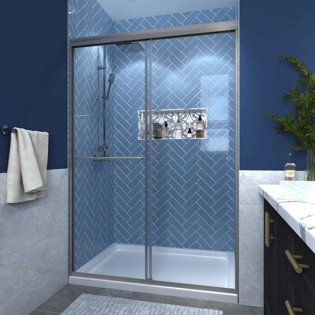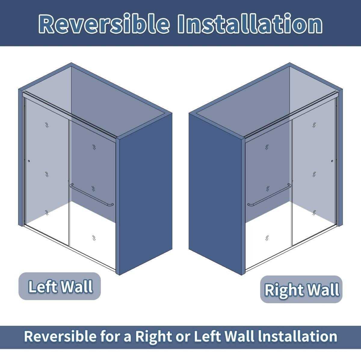 Glide 44-48 inch Wide x 70 inch Sliding Glass Shower Doors Frame in Nickel Sliding Glass Shower Doors The minimum threshold width 1-3/4 inch DIMENSIONS AND FINISH: 44 – 48 inch Width adjustable x 70 inch Height, Door clear tempered safety glass with SGCC certified. QUICK CLEANING GLASS COATING: Creates an easy to clean long lasting shield on glass surfaces. This coating reduces cleaning time and even cleaning frequency. Quick cleaning coating repels water and contaminates, and helps protect against staining and hard water build-up. It is easier to clean and maintenance, yet maintains its high gloss, bright, shiny and clean as even after long time. Explosion-proof GLASS COATING: A transparent safety film bonded on the panels, in the event of breakage, the film is able to successfully hold all fragments in place and even hold the broken panel mount in place, allowing an easy disposal and provide proper safety. Sliding Door Delivers Smooth Operation: Sliding Glass Shower Doors with a smooth, effortless sliding mechanism that opens from both panel sides, this door provides seamless access to your tub. 2 Large Stainless Steel Handles – More Towel Space. 2-Way Sliding – Easy Open and Easy Entry. Reversible for “right” or “left” door opening installation. FRAME and REVERSIBLE DOOR: Exbrite frame design shower door makes your bathroom more modern and brighter, also convenient to slide by using the shower door pull hand. The reversible door of the shower slides to the right or the left, depending on user preference. This makes for an easy installation process and assurance that your product will continue to function for years to come. fine MATERIAL: tempered safety glass with ANSI Z97.1 certified, for easy cleaning and to resist water spots; Large solid stainless steel rollers creating a quiet, smooth and effortless sliding.