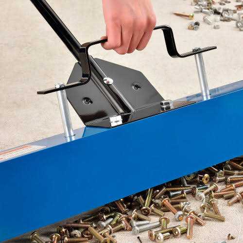 These manual push magnetic floor sweepers allow easy metallic debris pick-up on virtually any floor surface. Magnetic sweepers help get rid of damaging steel, nails, wire, screws and other metallic debris. Simple-to-use magnetic sweepers automatically pick up steel objects to provide an alternative solution to brush sweepers, vacuums and power sweepers. Can be used over asphalt, concrete, grass and gravel. Handle and roller bearing wheels allow easy push-broom style sweeping over hard floor surfaces and rough terrain. Features a load release lever for easy removal of debris. Includes 7 wheels and a removable handle for easy storage.