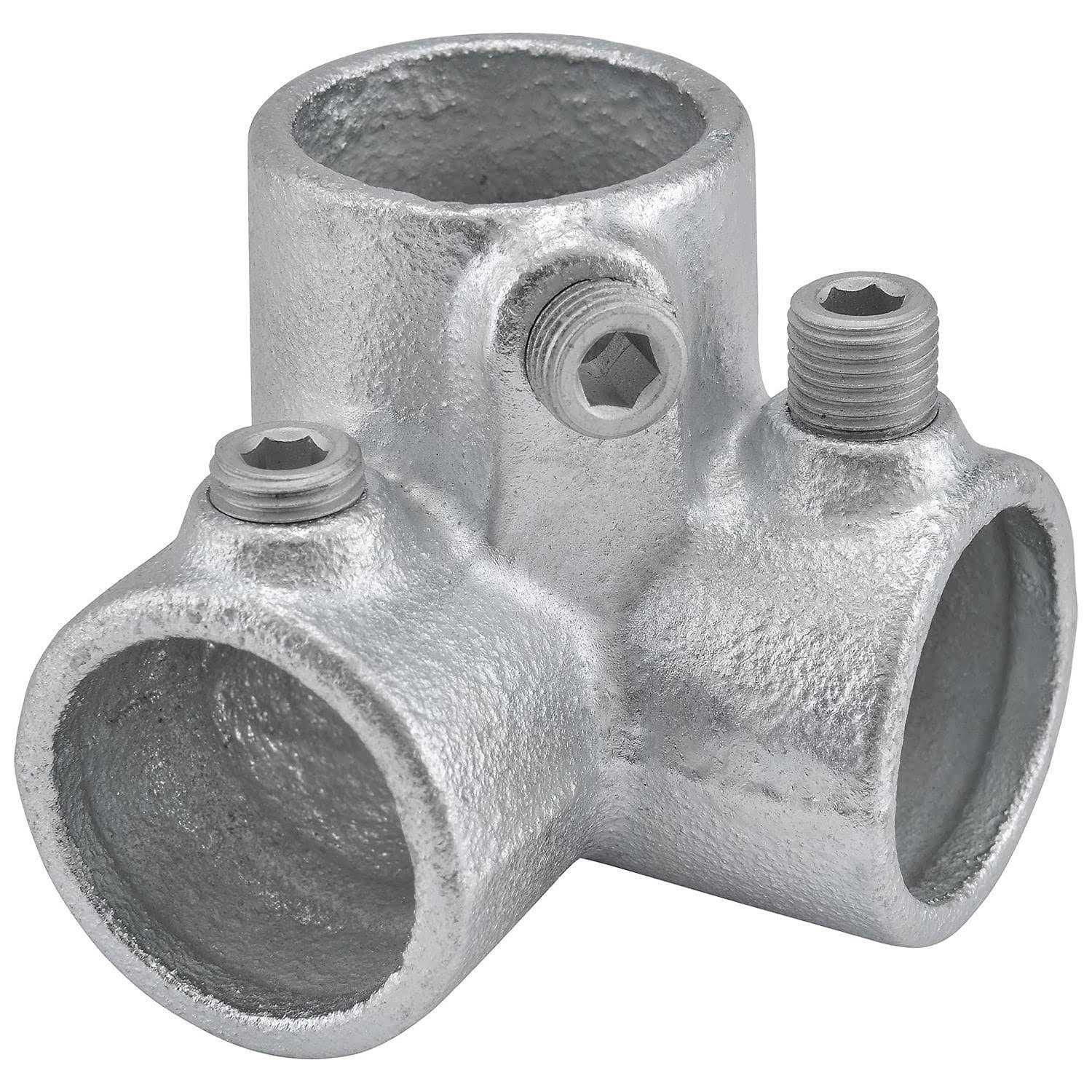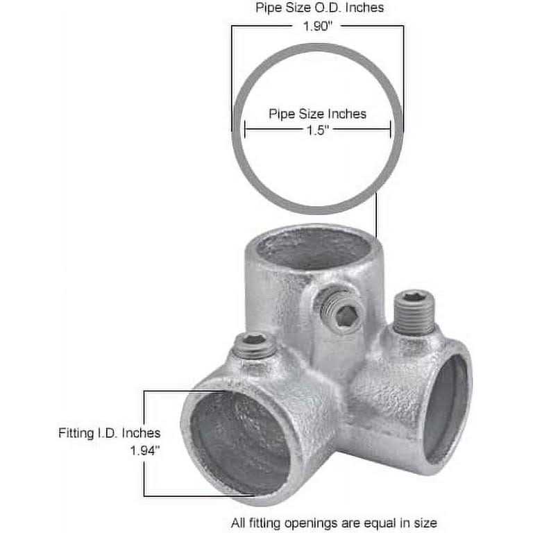 Strong iron material includes a galvanized finish for corrosion resistance and long term use. Side Outlet Elbow Pipe Fitting provides a three way joint when building pipe hand railing, guard rail or other pipe-based structures. Typically found on the top hand rail, a side outlet elbow can also be used as a corner joint for benches, work tables or other rectangular structures. Fitting locks onto pipe with hardened set screws included for secure connection.